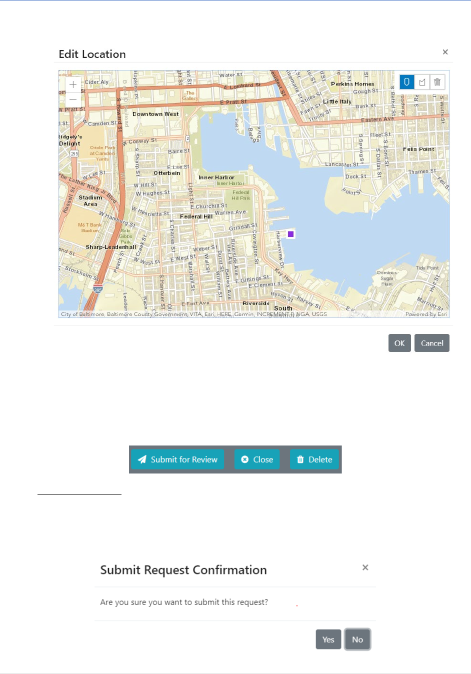 - From here, the user can click the Pin or Polygon Shape to either drop a point or polygon to mark the requests spatial locations on the map.