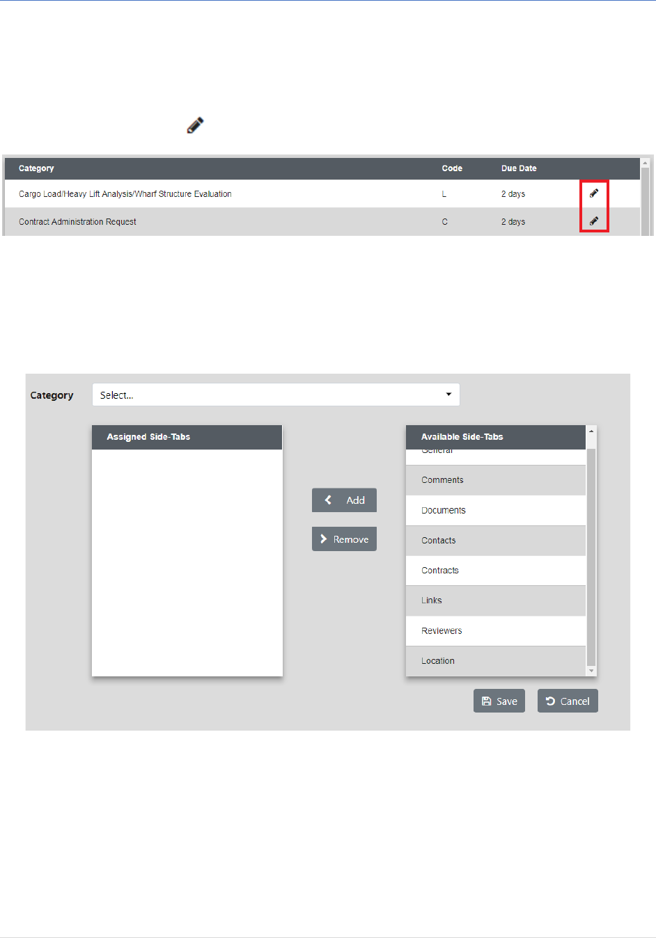 • In the Side-Tabs tab, administrators can select the Category they want to add or remove