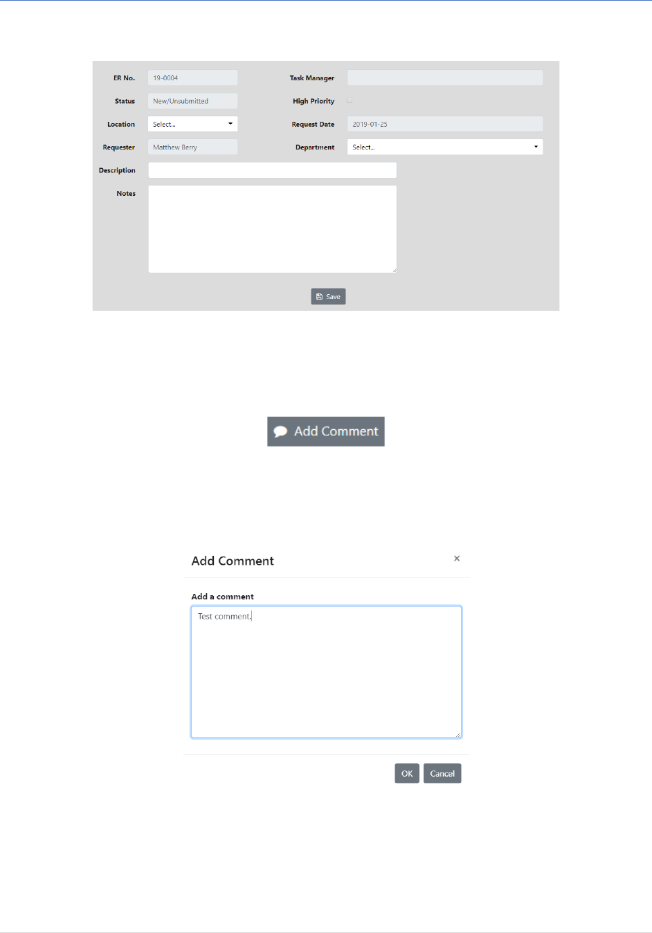 - From the Comments tab on the New Request Page, users can click on the Add Comment button to add a comment.
