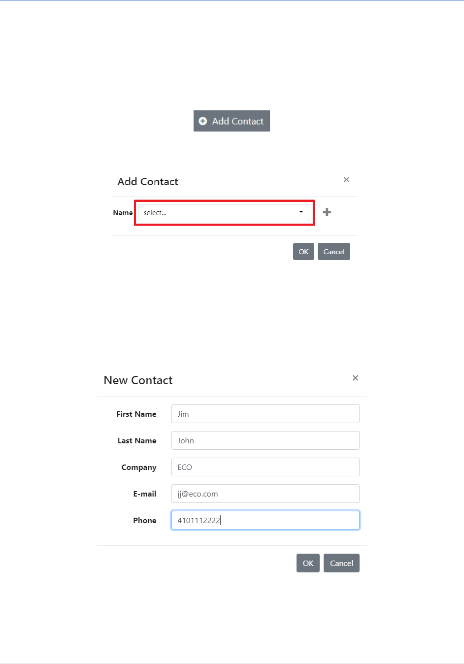 - Click OK. The new contact will then appear in the Add Contacts pop-up.