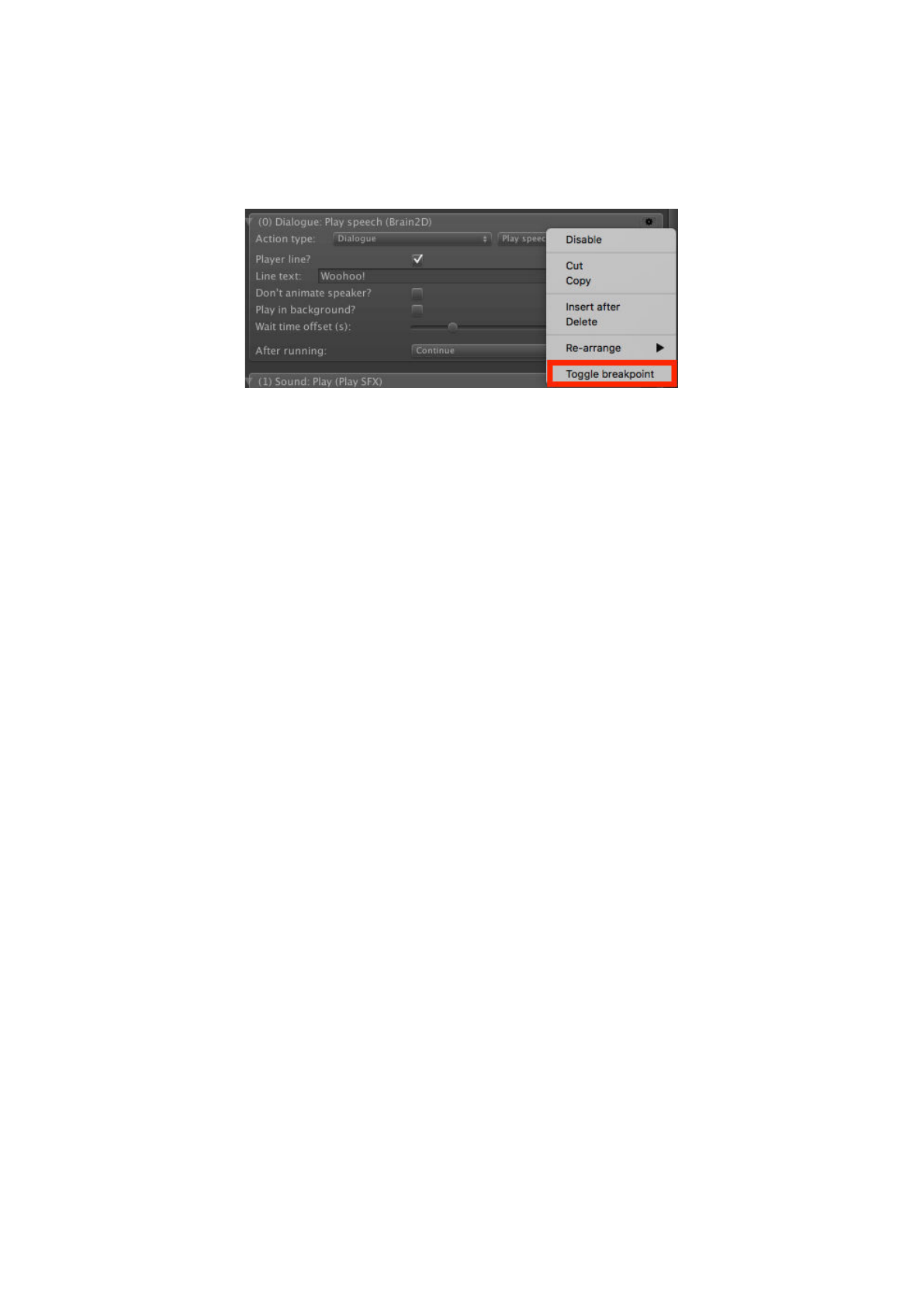 Actions can be marked as breakpoints, causing the Unity Editor to pause just before they