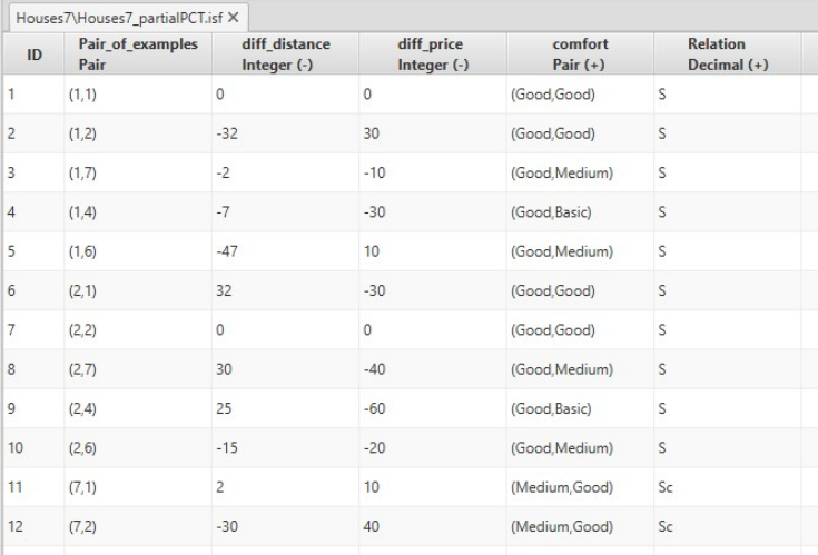 objects from isf table. Arcs represents outranking (S) or non-outranking (Sc)