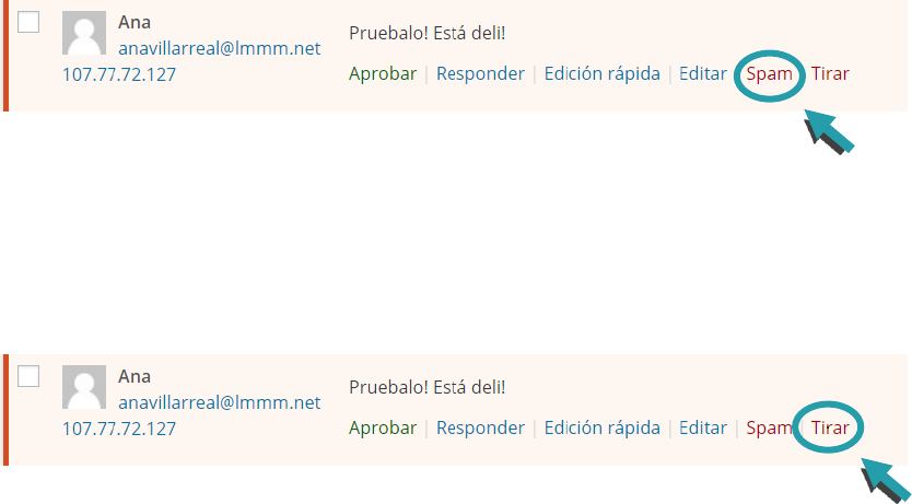 Para marcar un comentario como spam se posiciona el cursor sobre el comentario y se