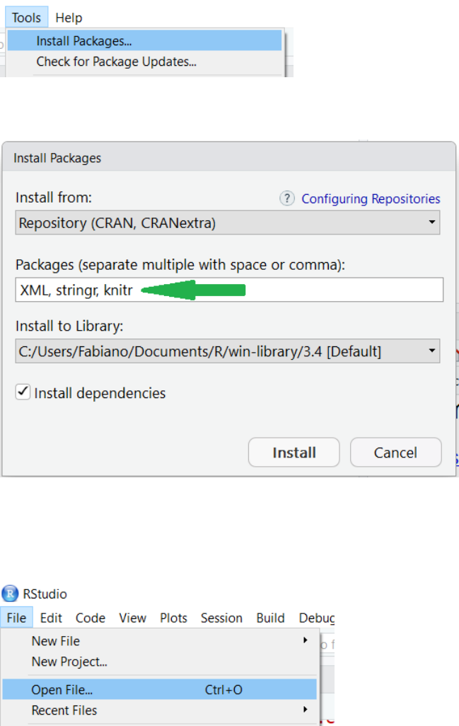 e “knitr”. Selecione o menu “Tools->Install Packages...”