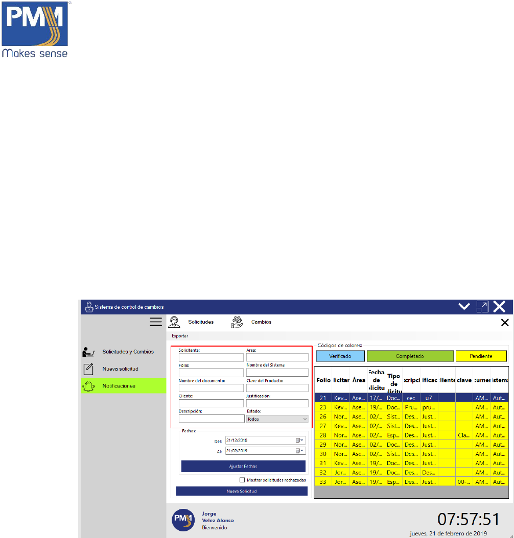 1. En la ventana de “Solicitudes y cambios” llenar los campos que se desean buscar. La