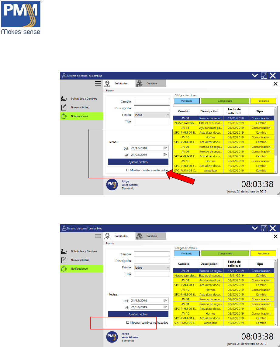 3. Cambios rechazados. Dar click en el checkbox “Mostrar cambios rechazados”.