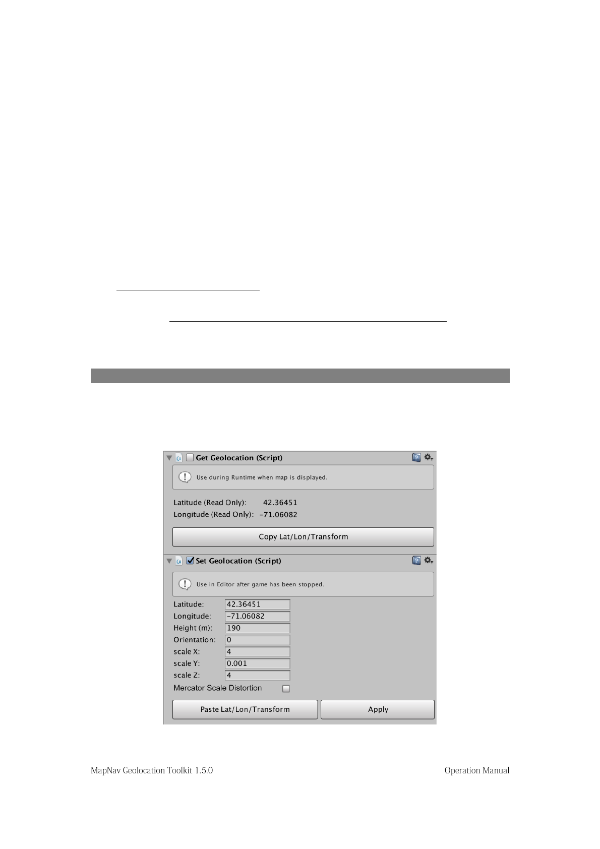 object on the map and click on the “Copy Lat/Lon/Transform” button (GetGeolocation