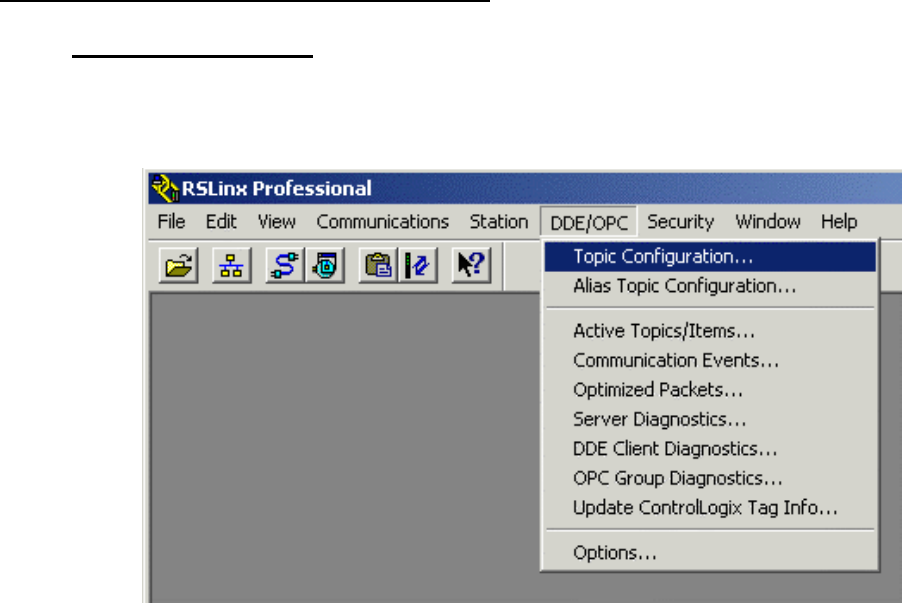 RSLinx. Click on Topic Configuration at DDE/OPC from the menu bar.