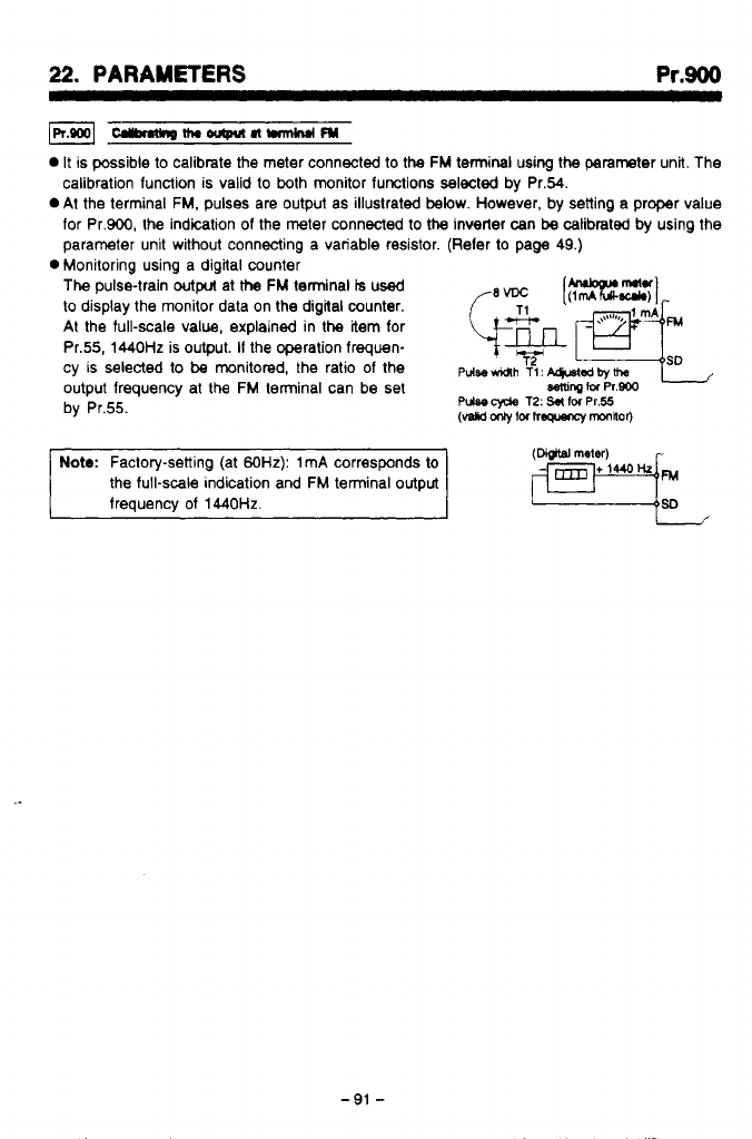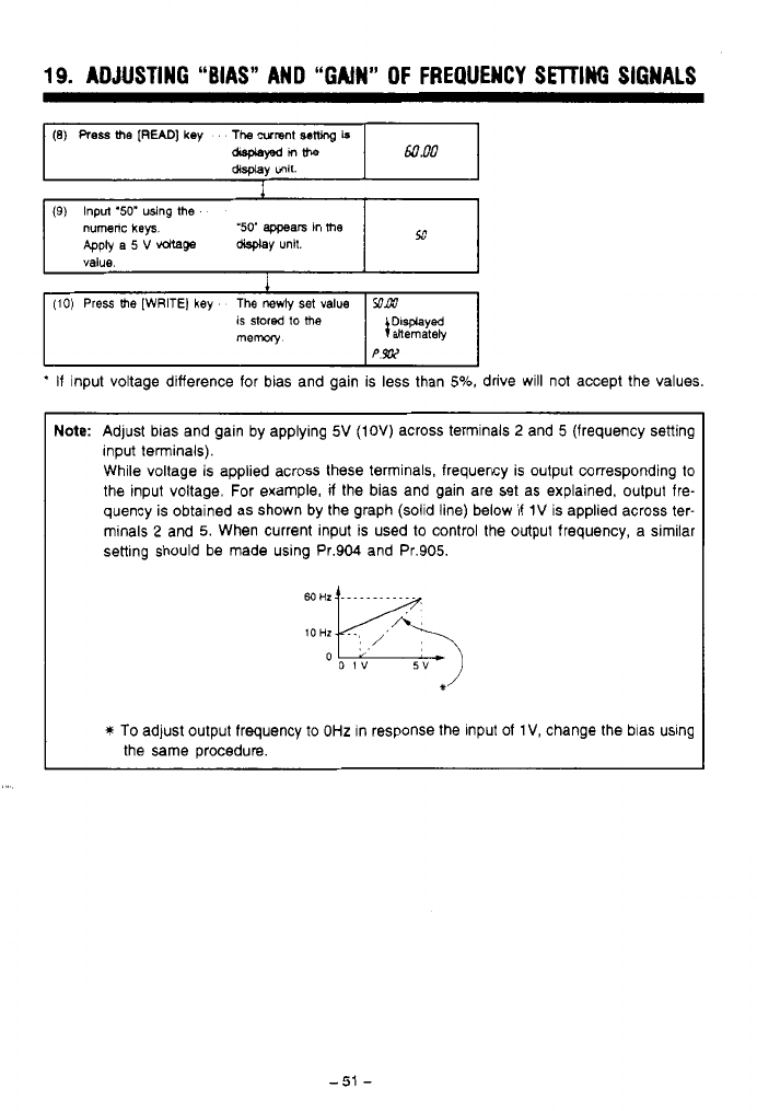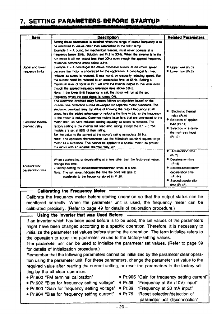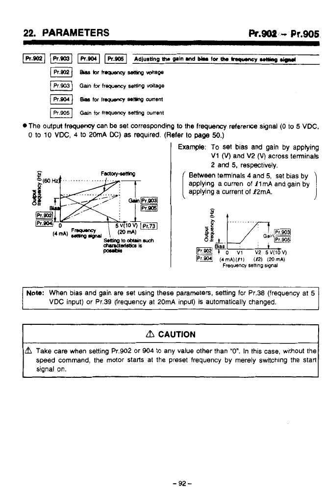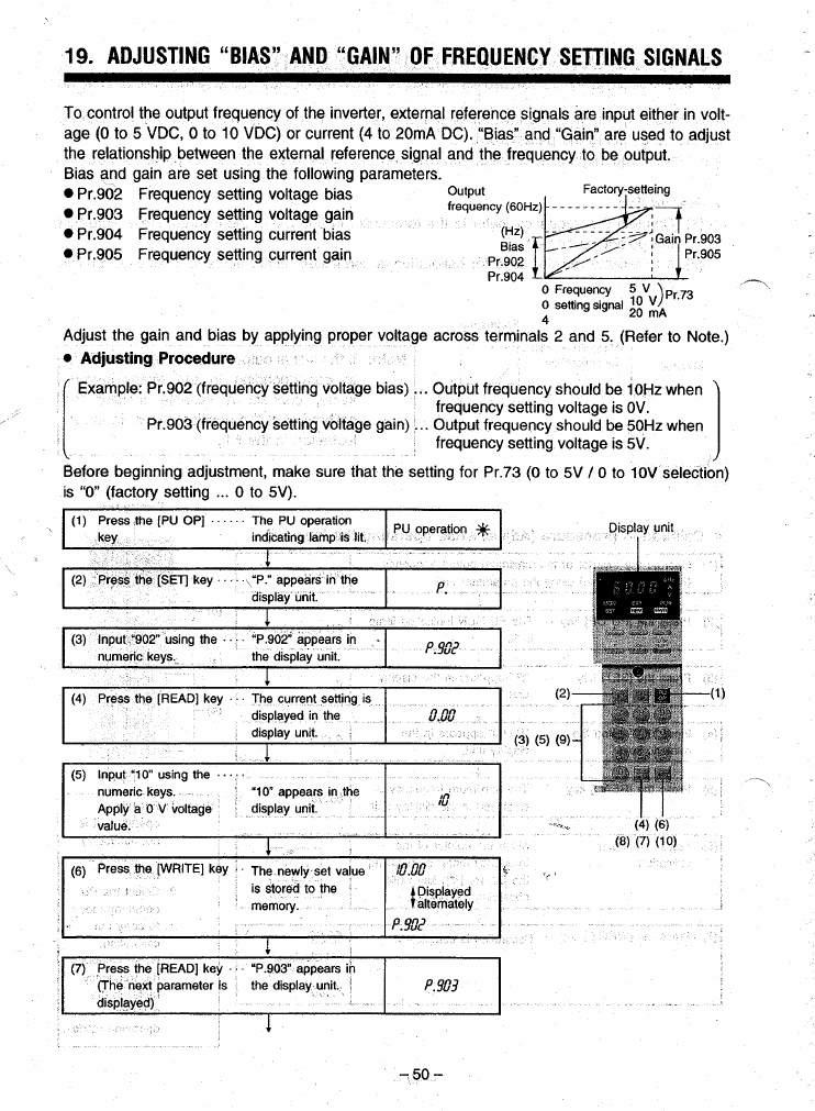 - Pr.902, Pr.903, Pr.904, Pr.905: Adjusting the gain and bias for the frequency setting signal
