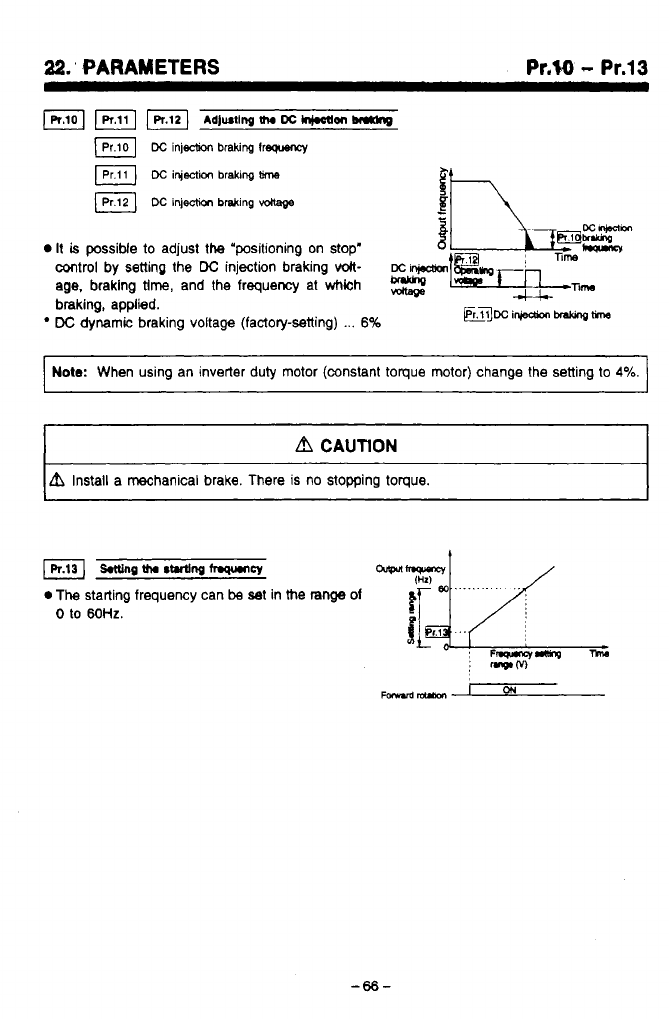 - Pr.10, Pr.11, Pr.12: Adjusting the DC Injection braking
