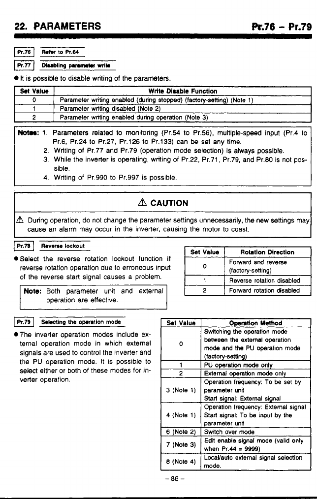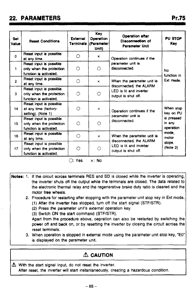 - Pr.75: Reset selection/detection of parameter unit disconnection