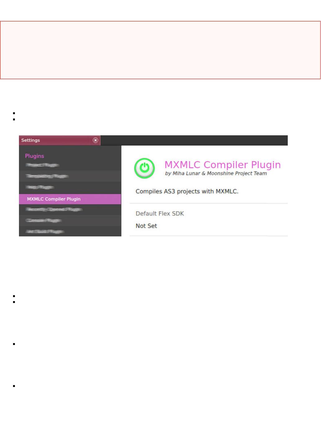 -- In Moonshine choose File -> Settings -> MXMLC Compiler Plugin