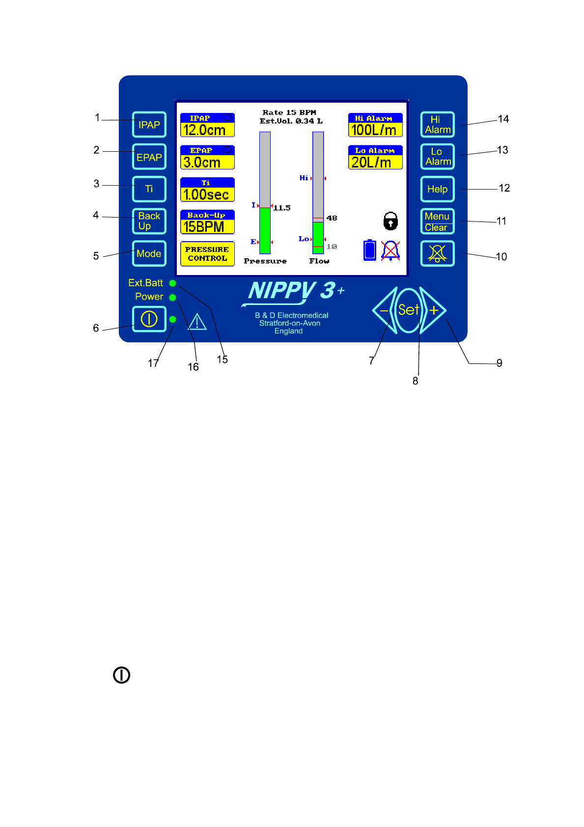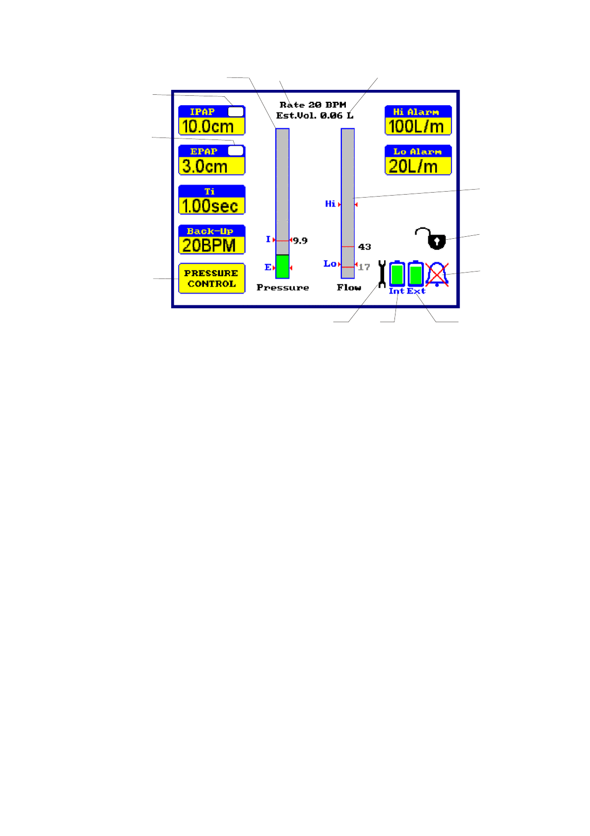 the fascia panel. The Pressure, estimated Tidal Volume, Rate and all settings are