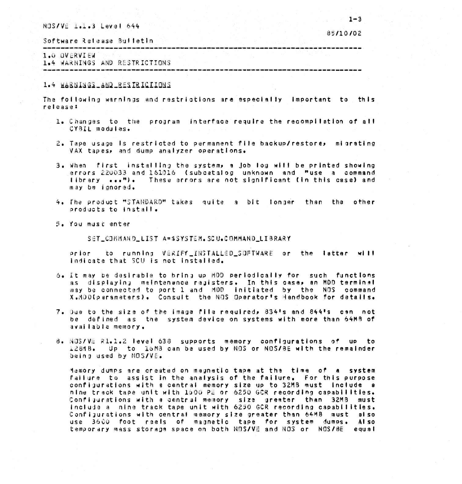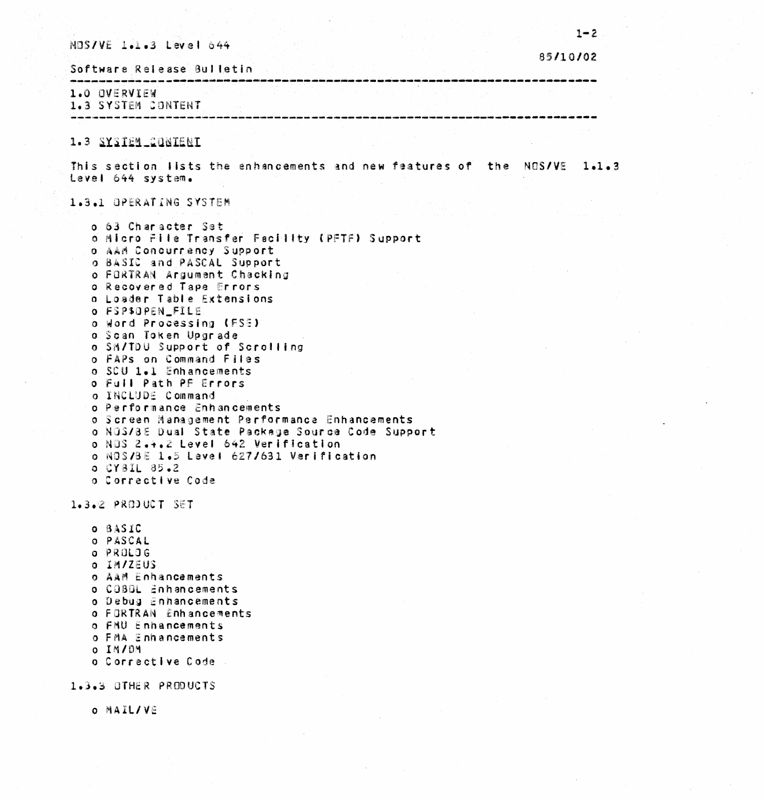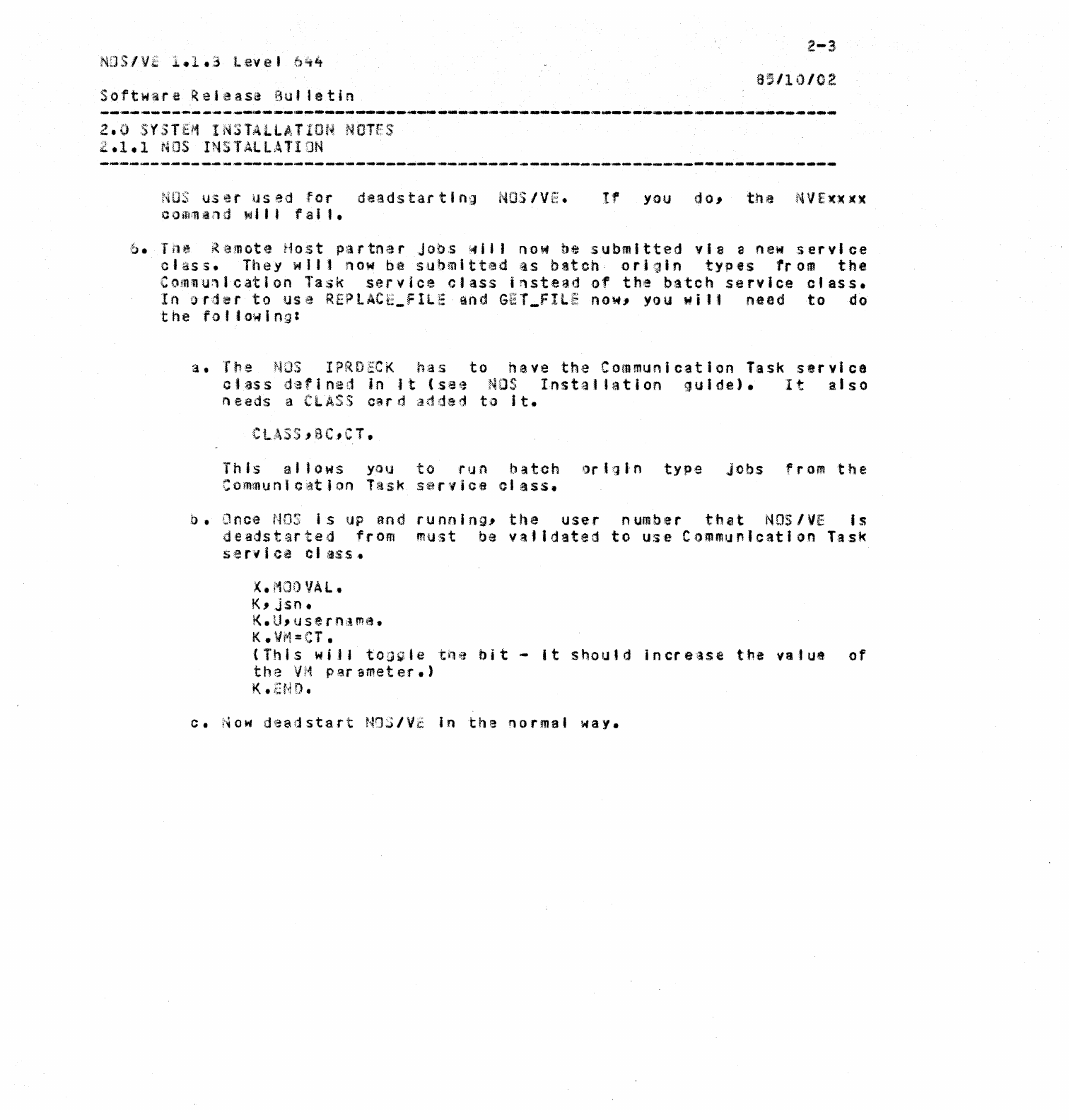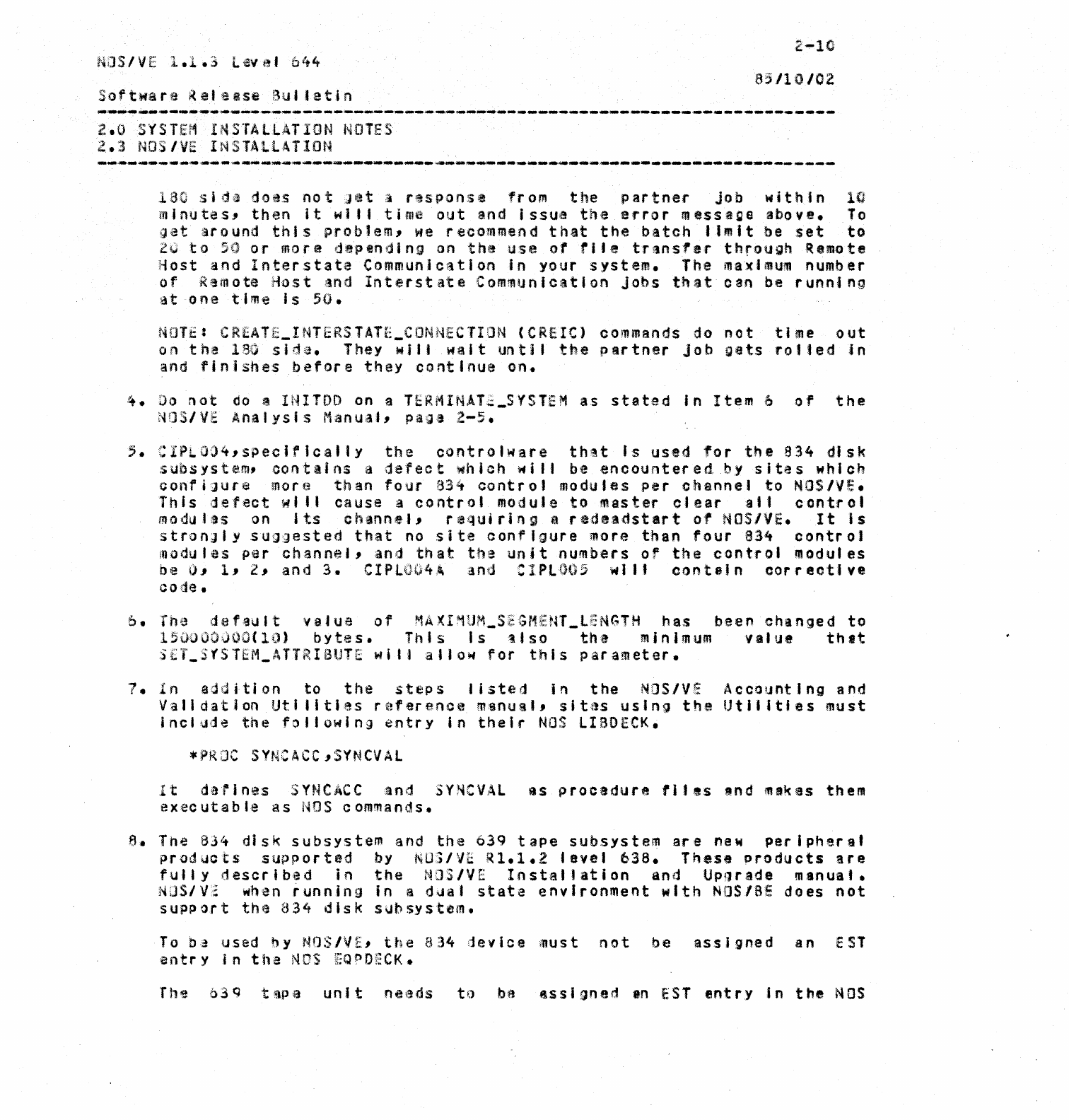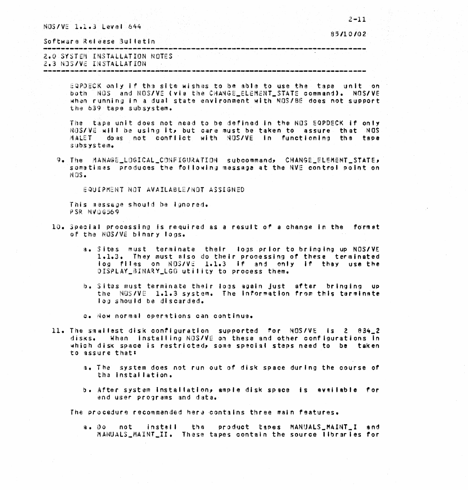 User Manual: NOS_VE_1.1.3_Level_644_Software_Rel_Bulletin_Oct85