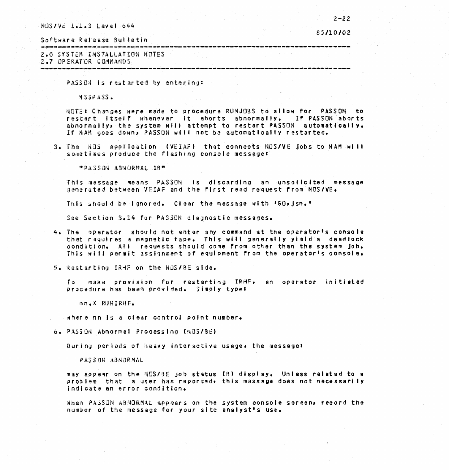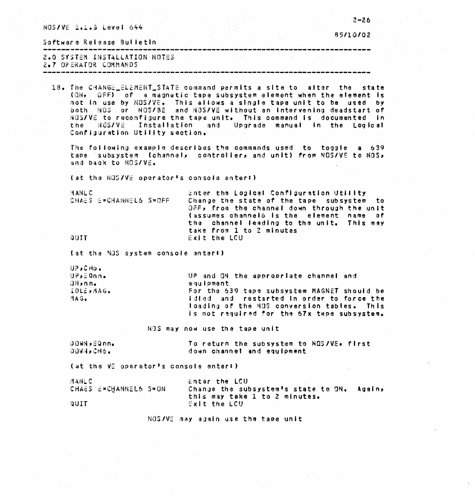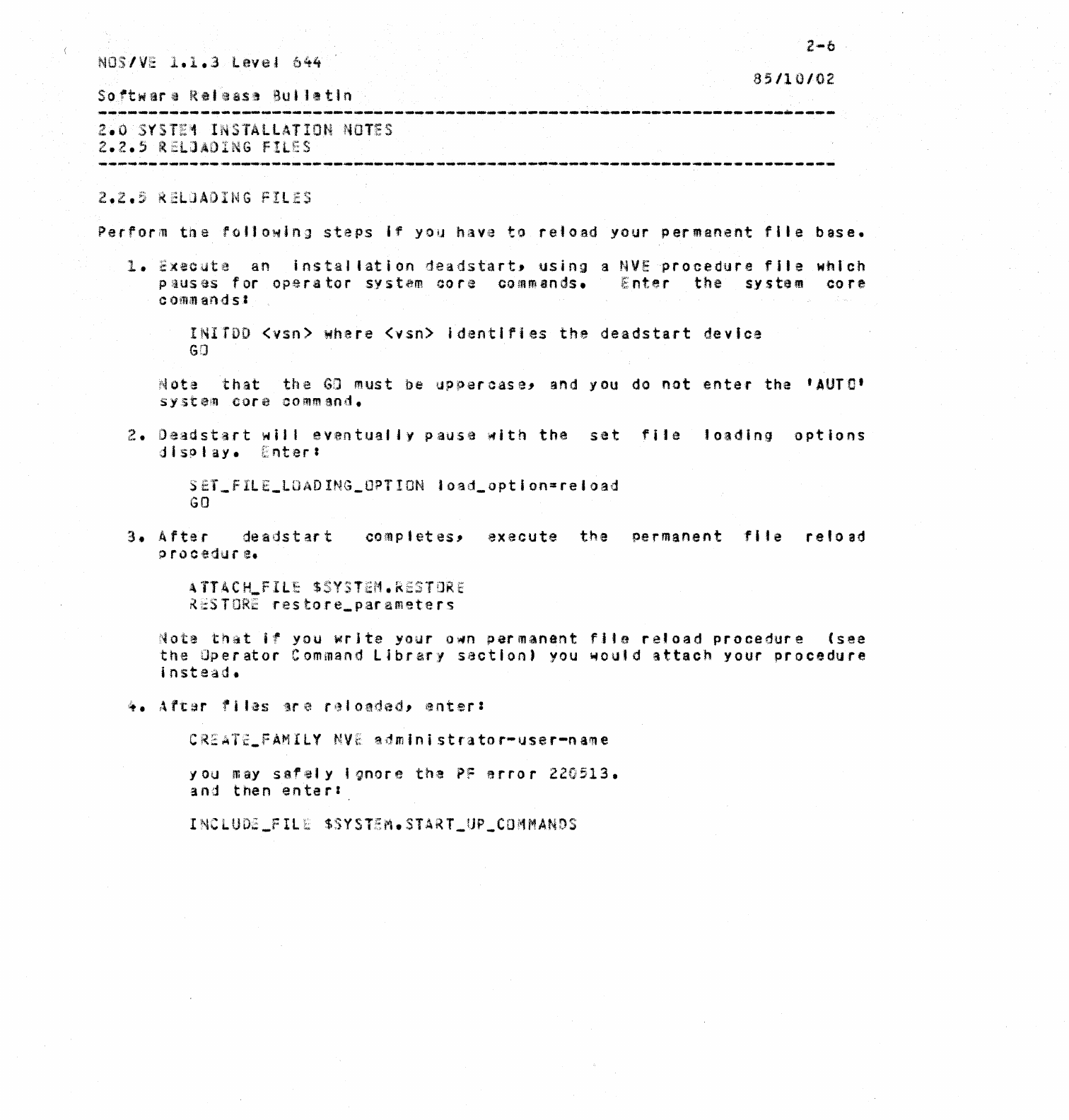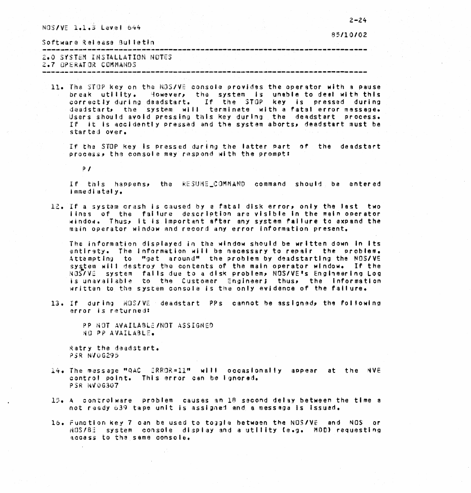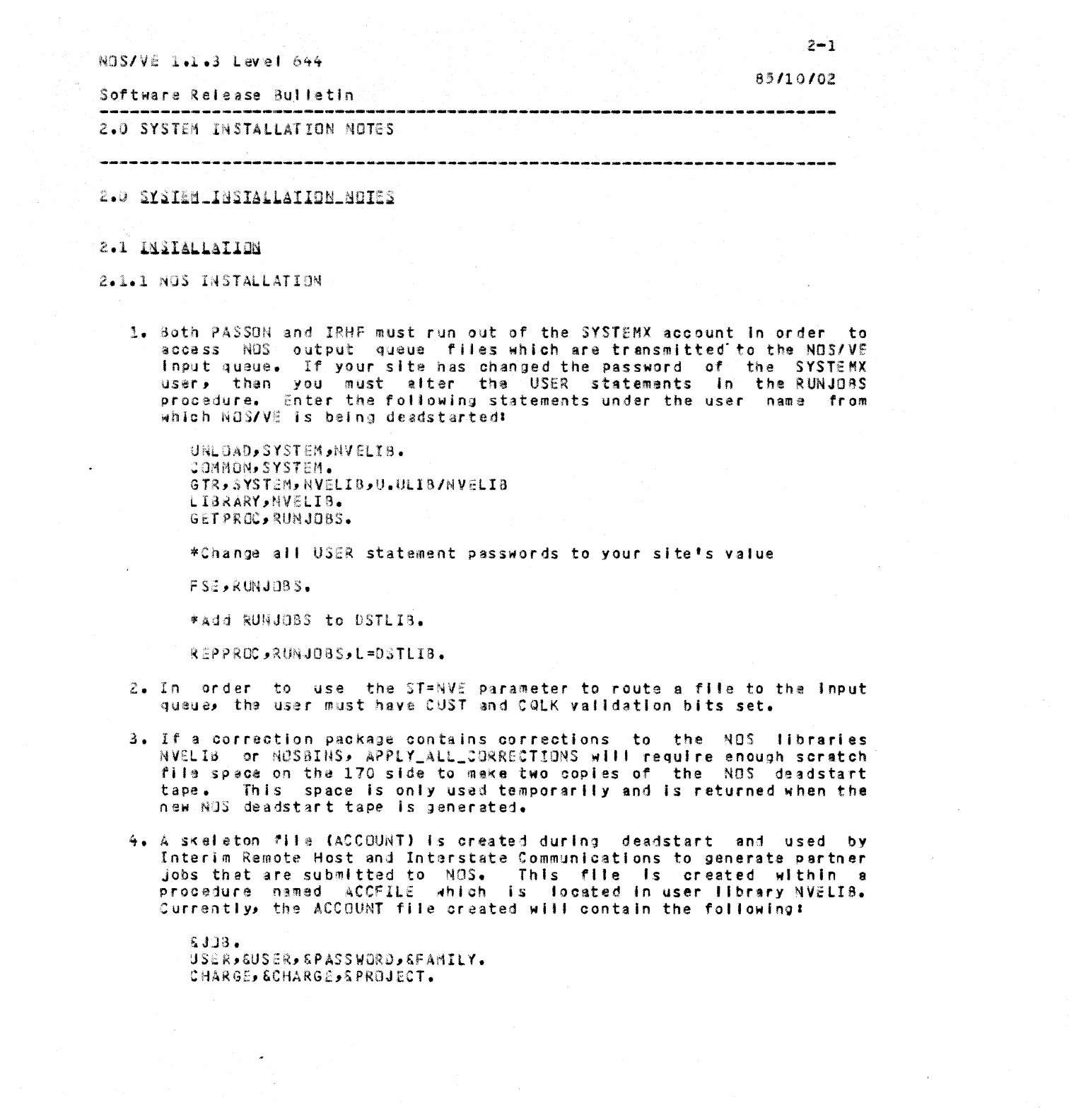 User Manual: NOS_VE_1.1.3_Level_644_Software_Rel_Bulletin_Oct85