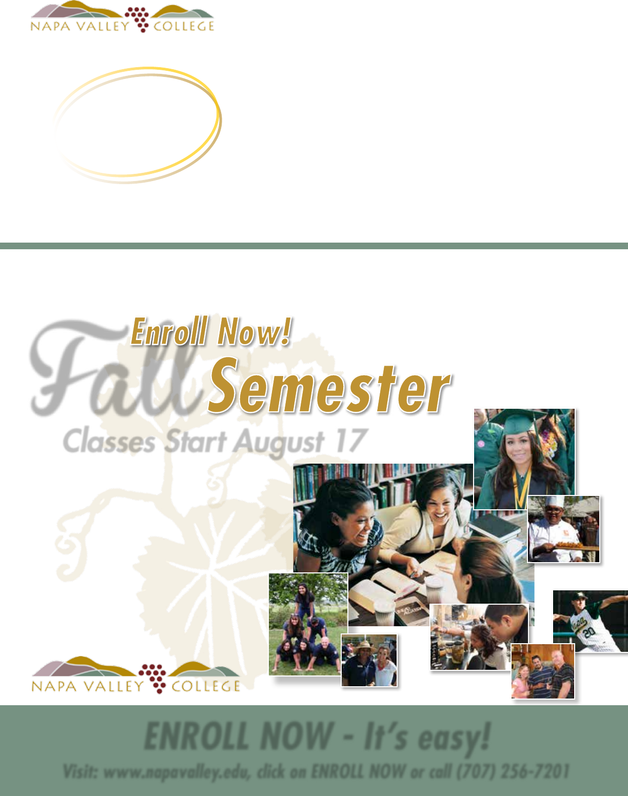 It’s easy to enroll! Visit www.napavalley.edu, click on ENROLL NOW or call (707) 256-7201