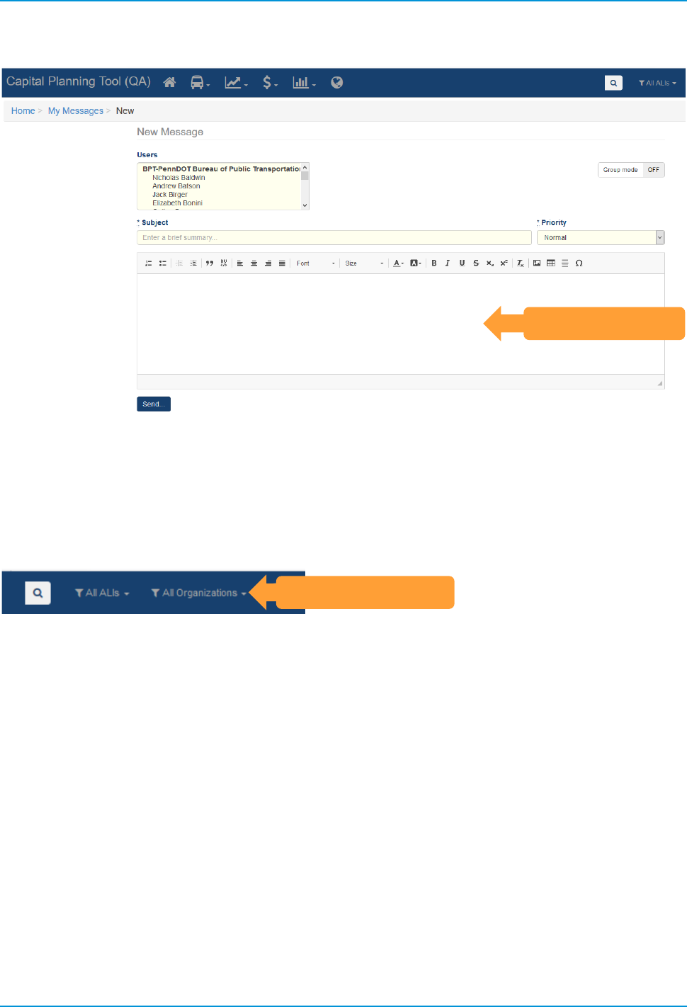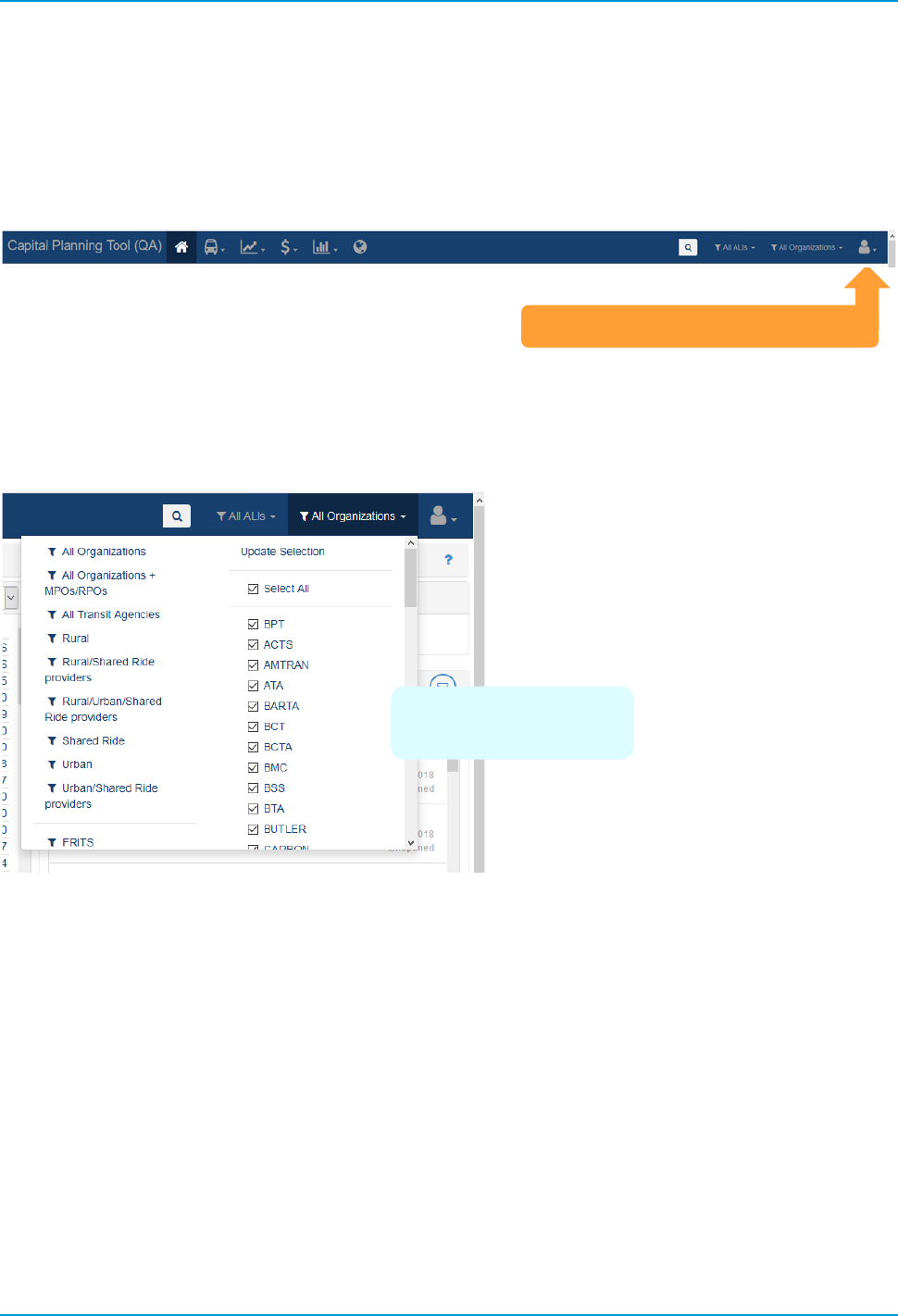 Clicking “All Organizations” provides a filter to pare down the different agencies you see. This also greatly