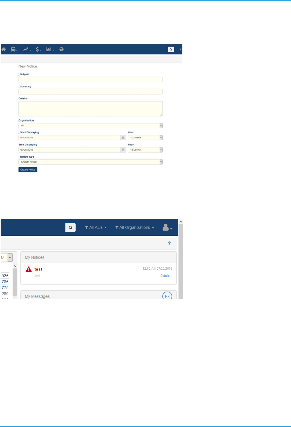 Notices provide information on the dashboard to user-defined sets of other users. The Notices interface