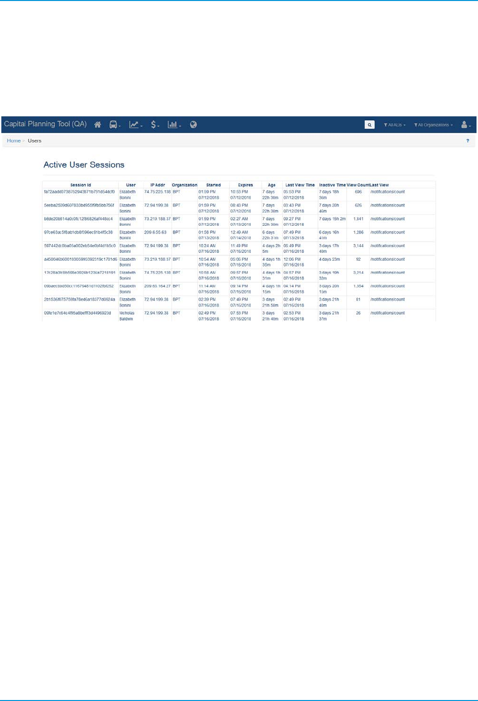 Administrators can see active user sessions and details about those logins, by accessing the Users link