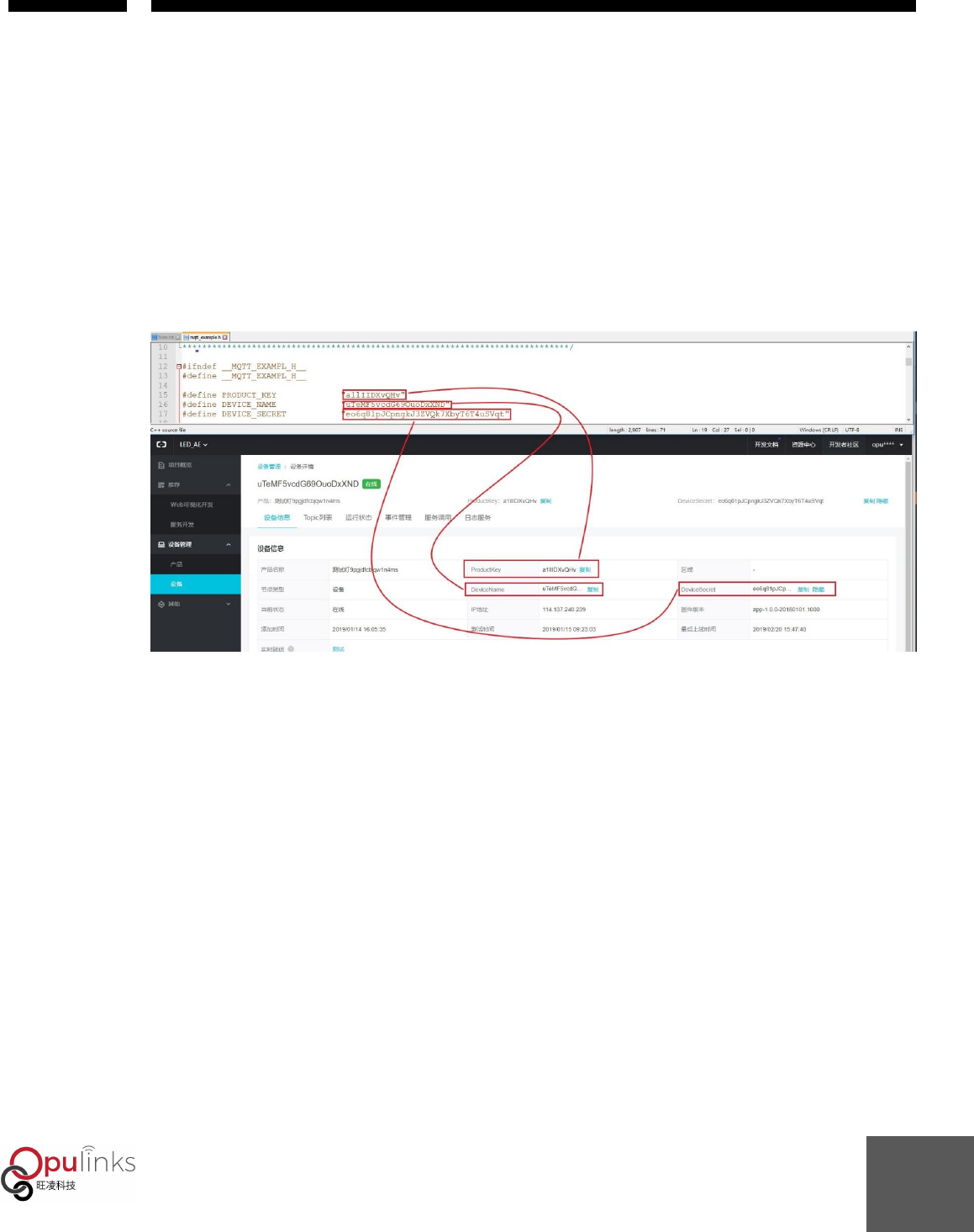 ◆ 此时会弹出三元组信息,记录相关信息,OPL1000 连接云端会使用,需要加入到头文件。