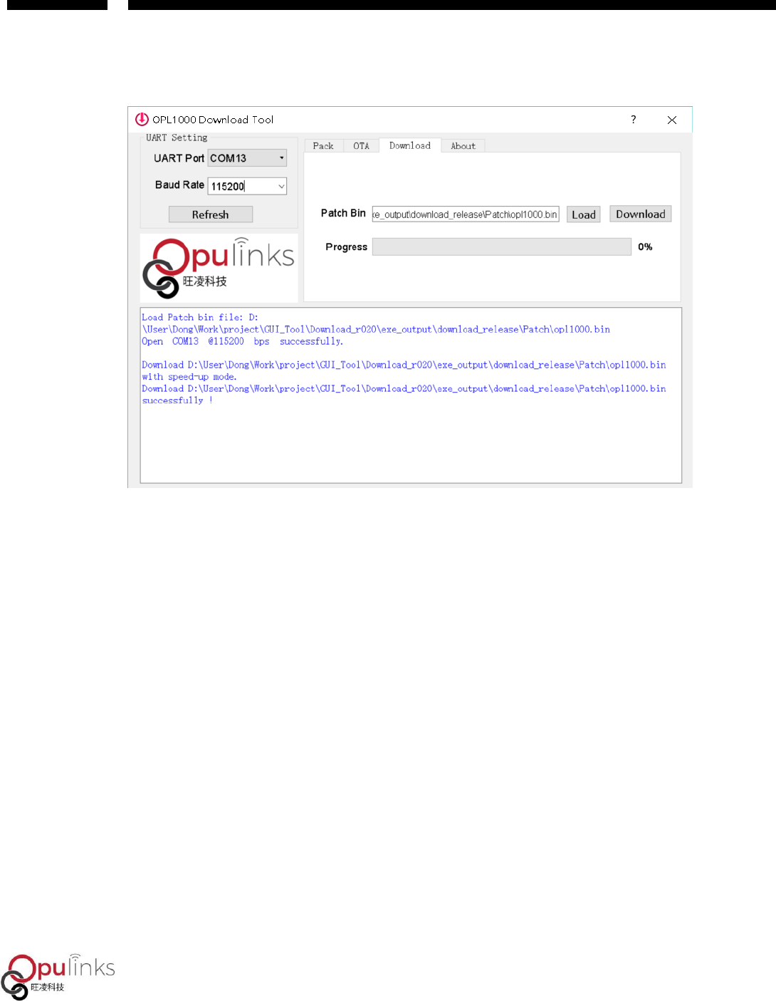 opl10000.bin begins to be downloaded to Flash, as shown in Figure 12. When the green progress