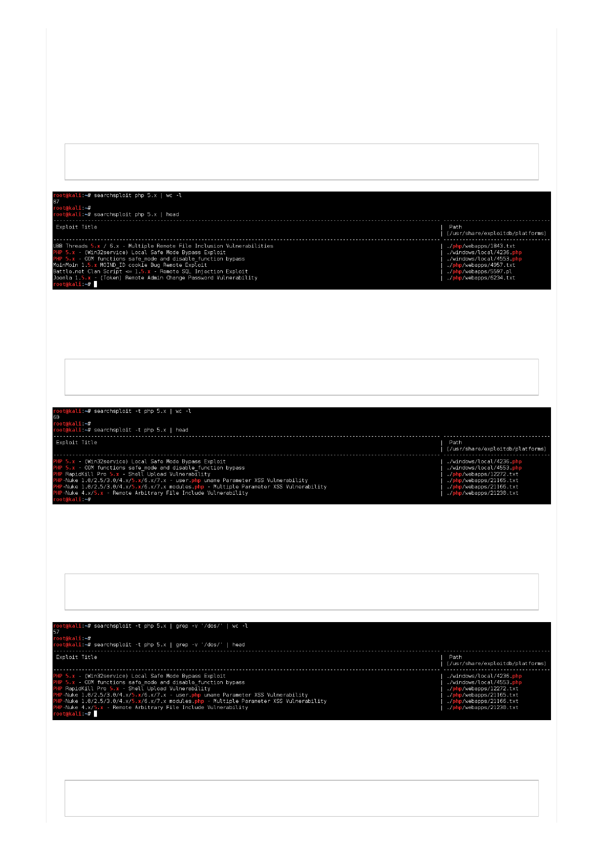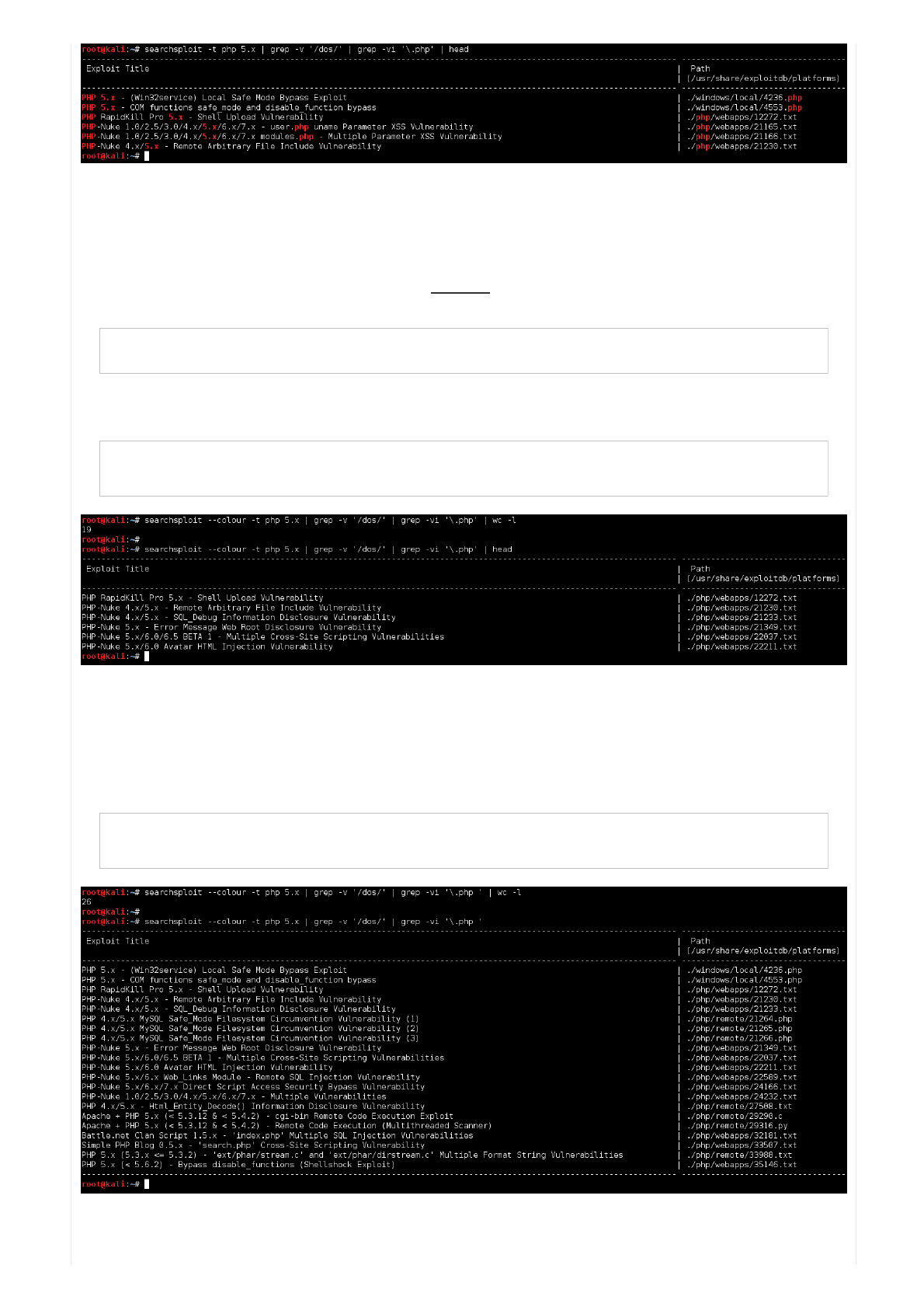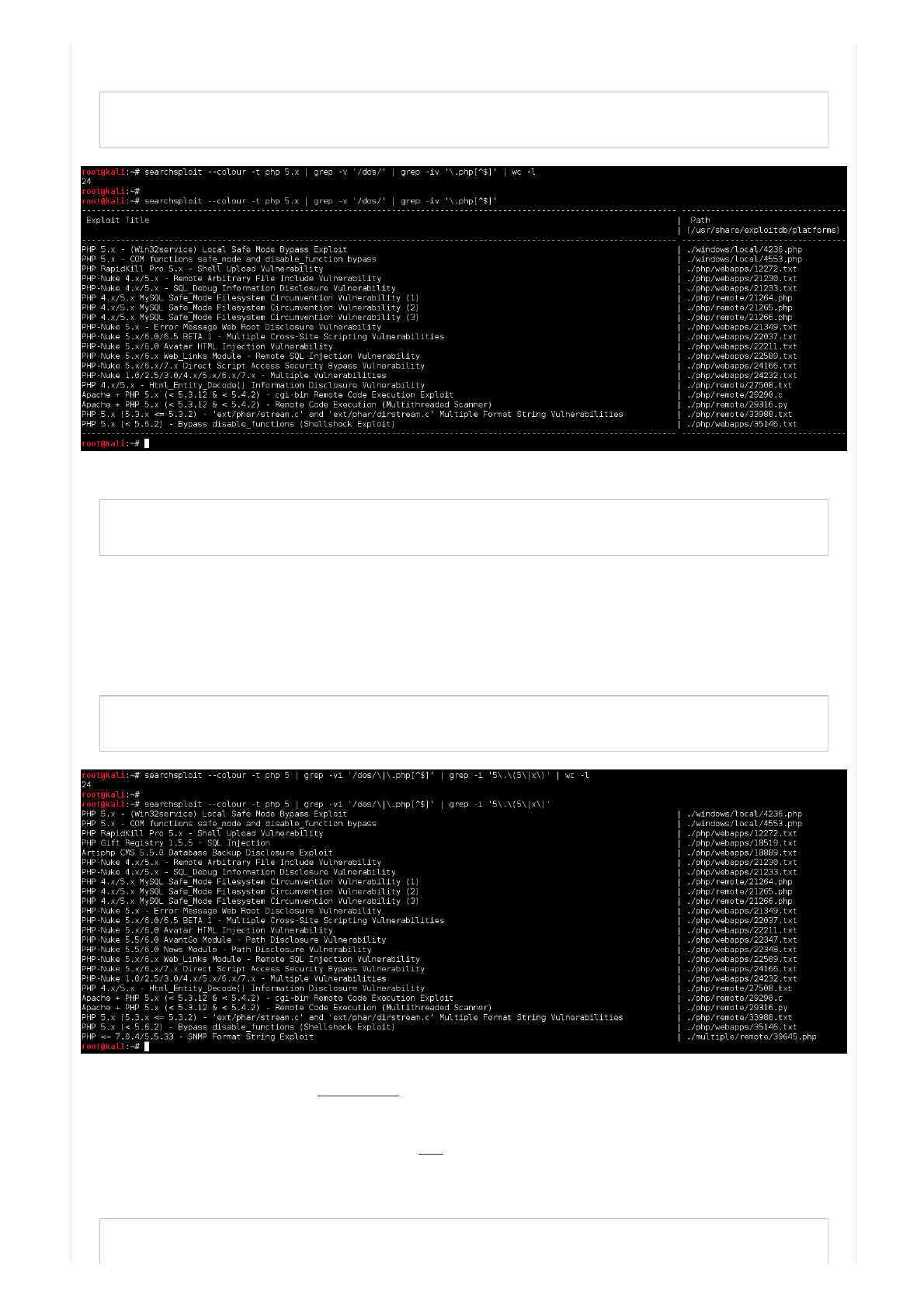 root@kali:~# searchsploit -t php 5.x | grep -v '/dos/'