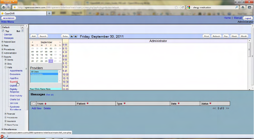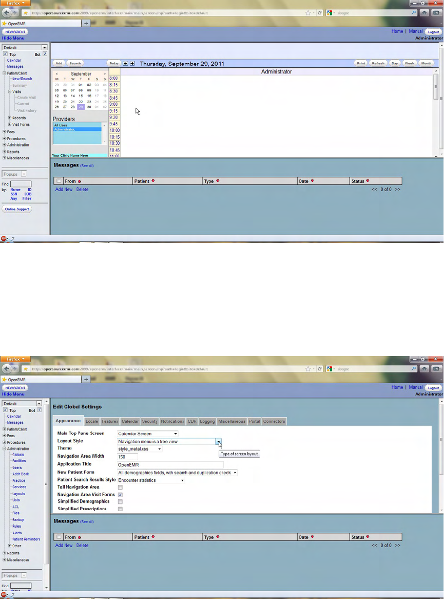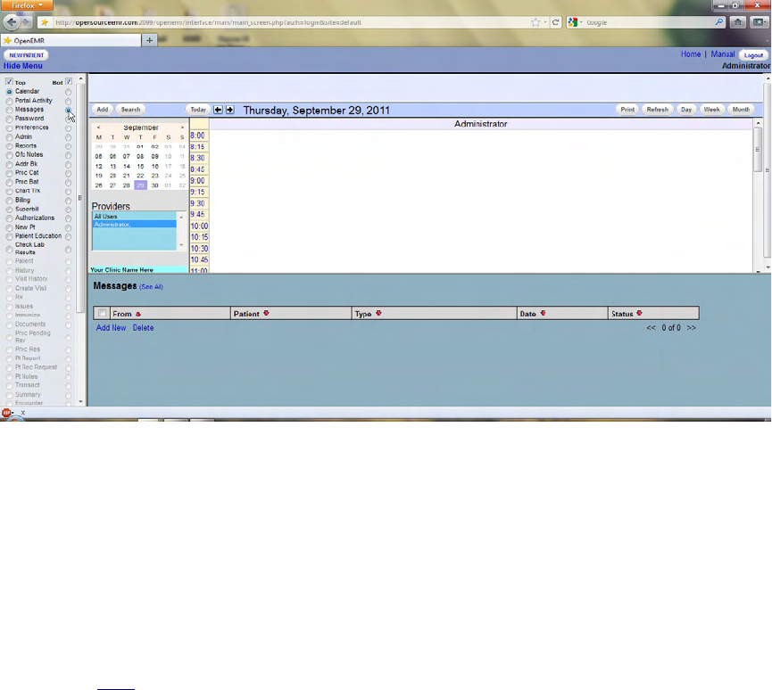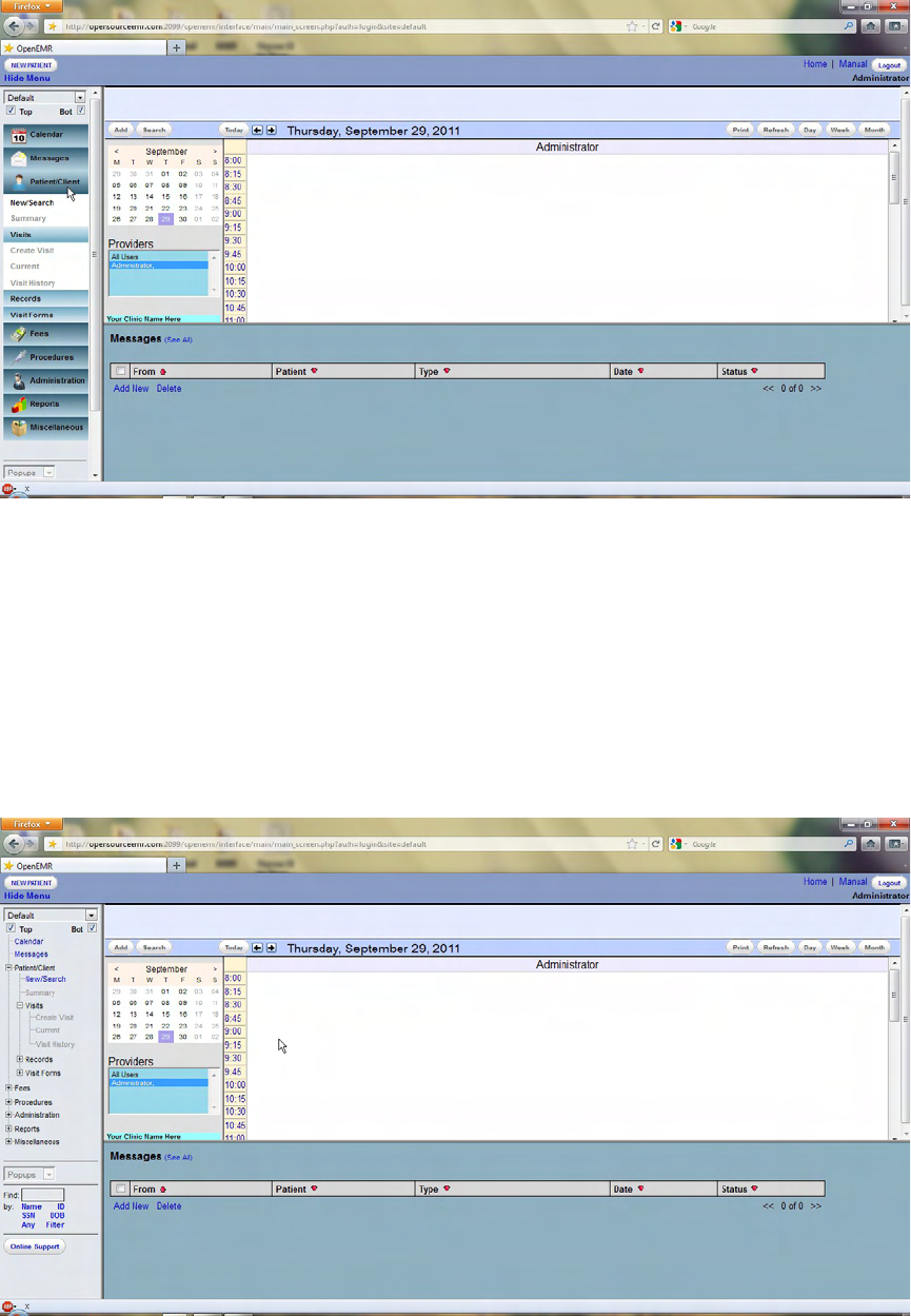 The Sliding Menu option is the default navigation scheme for OpenEMR 4.1. This expanding menu-style