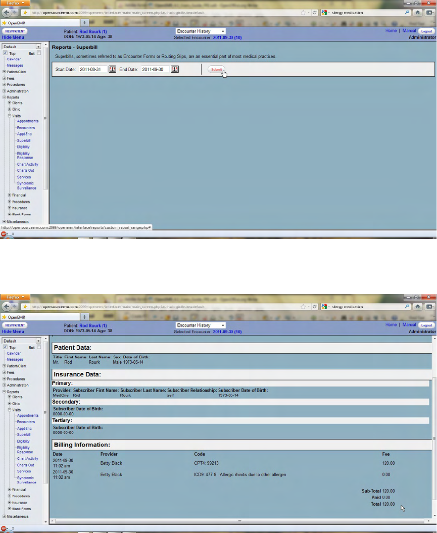 Clicking 'Submit' produces a report for each encounter in the date range, and shows patient demographics and