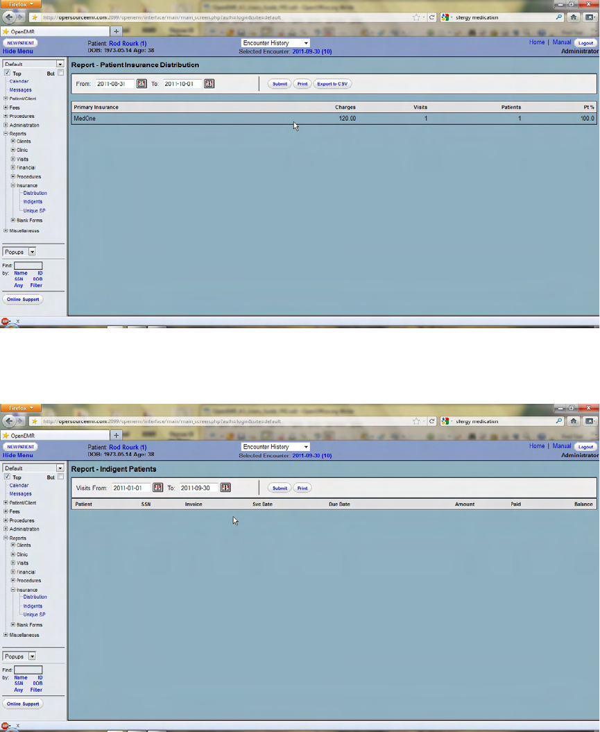 The Indigent Patients report lists all encounters for patients that were seen without insurance. (None shown