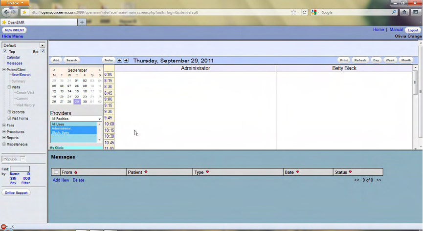 A successful login will bring you to the main screen of OpenEMR. The user is presented with two windows,