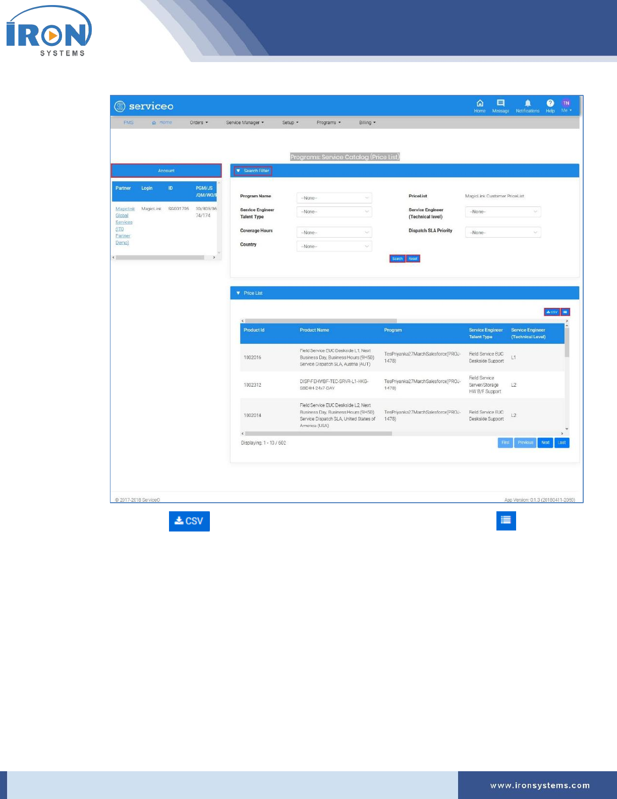 To view and search the Service Catalogue (Price List), perform the following steps: