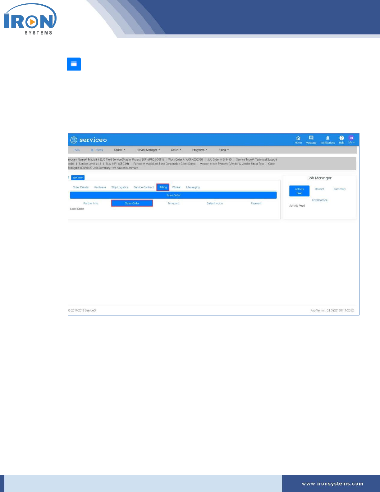 Tip: The Billing tab displays five tabs, namely Partner Info, Sales Order, Timecard, Sales Invoice