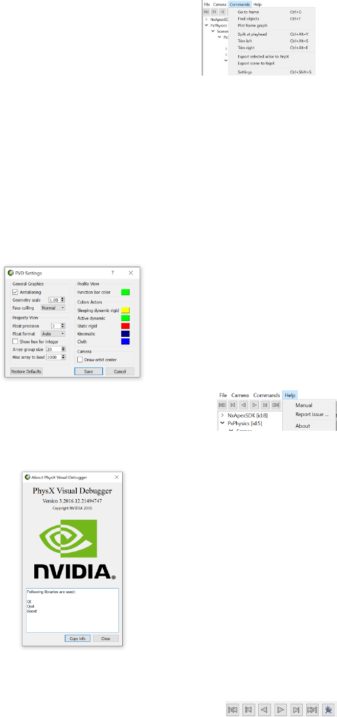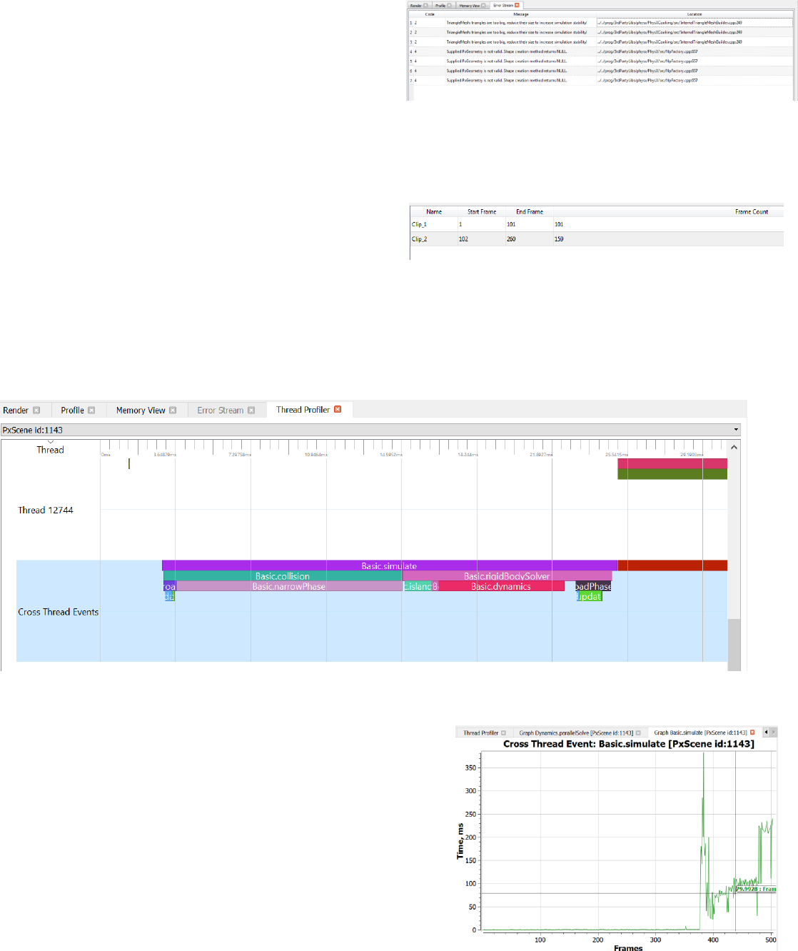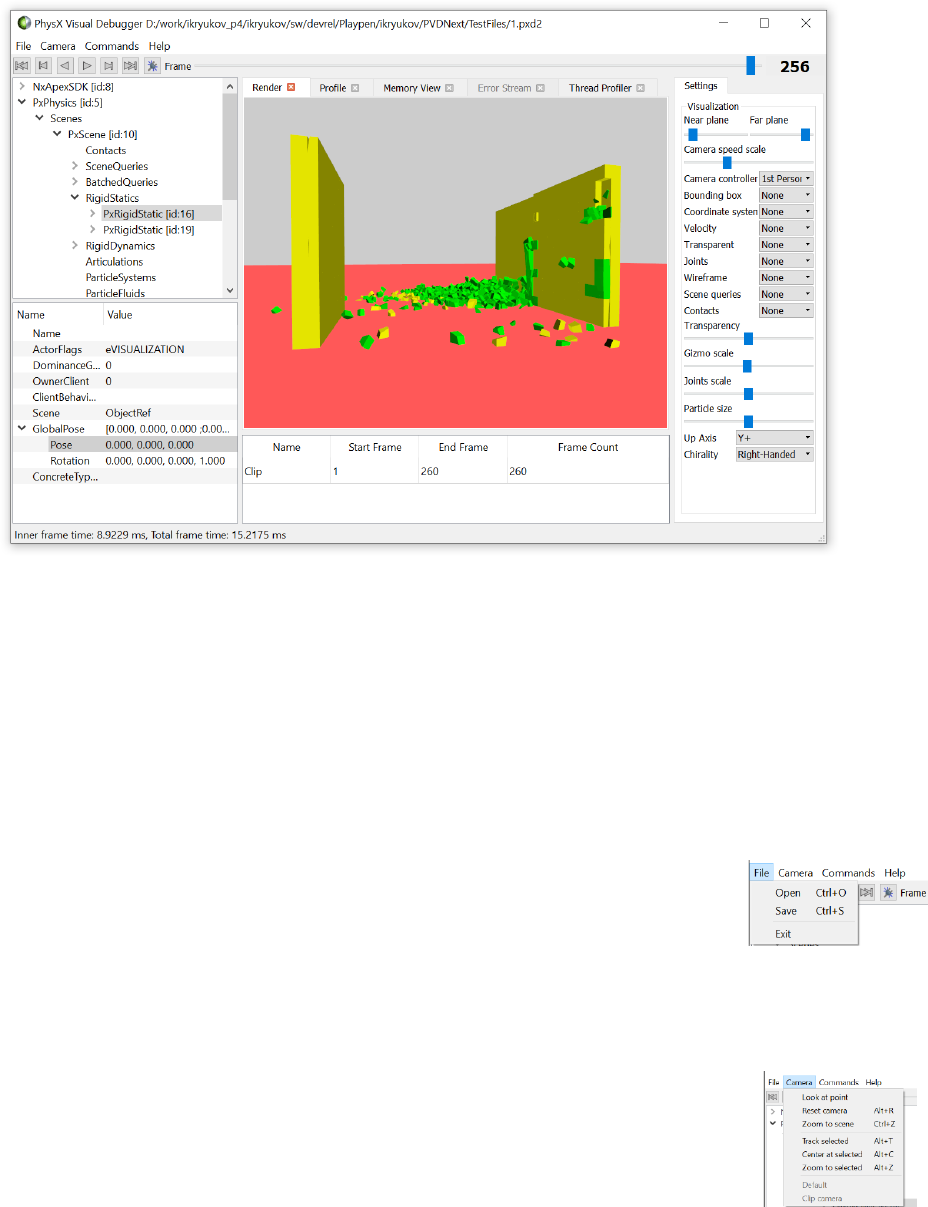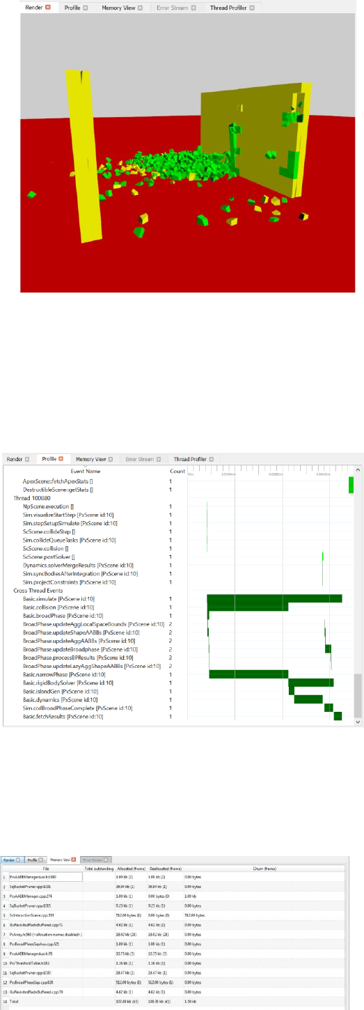 over time and in relation to each other. In addition it contains a 3D view of the scene from the PhysX SDK's perspective, allowing