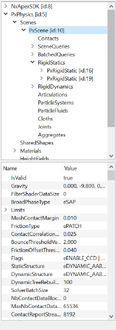 quick scene overview and understanding of the engine's current state of the PhysX scene, actors, shapes, queries and all properties