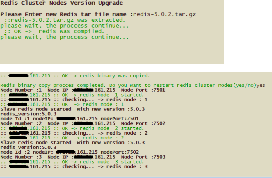 Chose 3 for version upgrade; Enter Redis tar file name ; Check the results