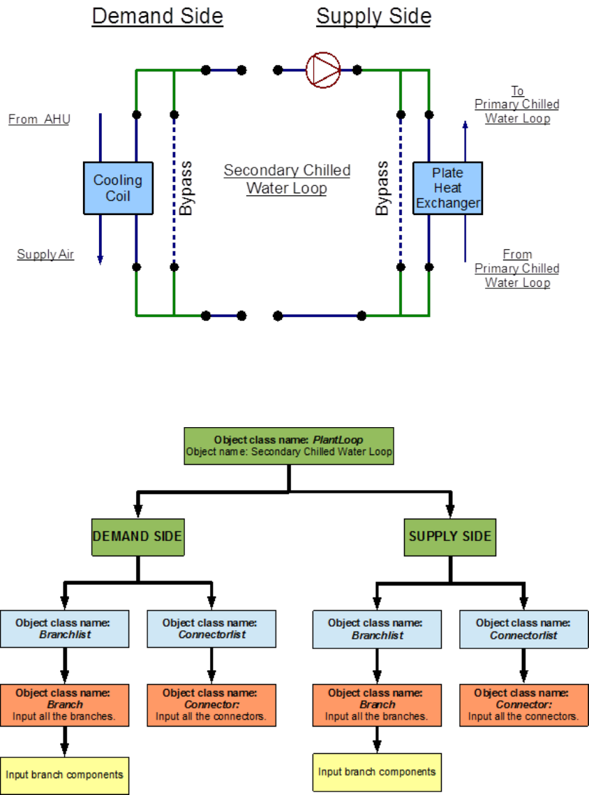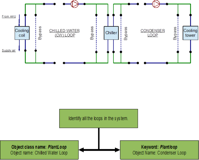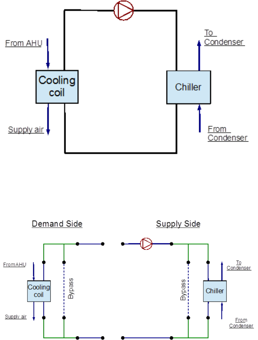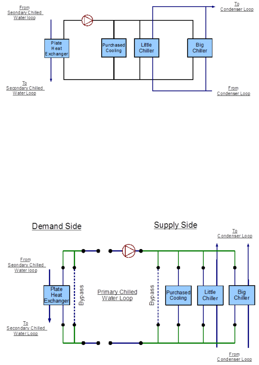 and the demand side contains the chillers. The loop is operated by using plant equipment