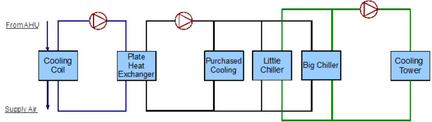 The main components on the demand side half loop are the small constant COP chiller and