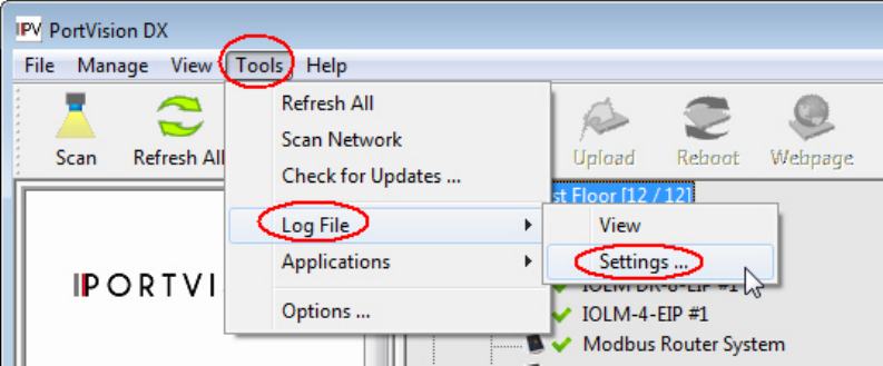 1. From the Main screen, click the Tools menu, click Log File, and then click the Settings...