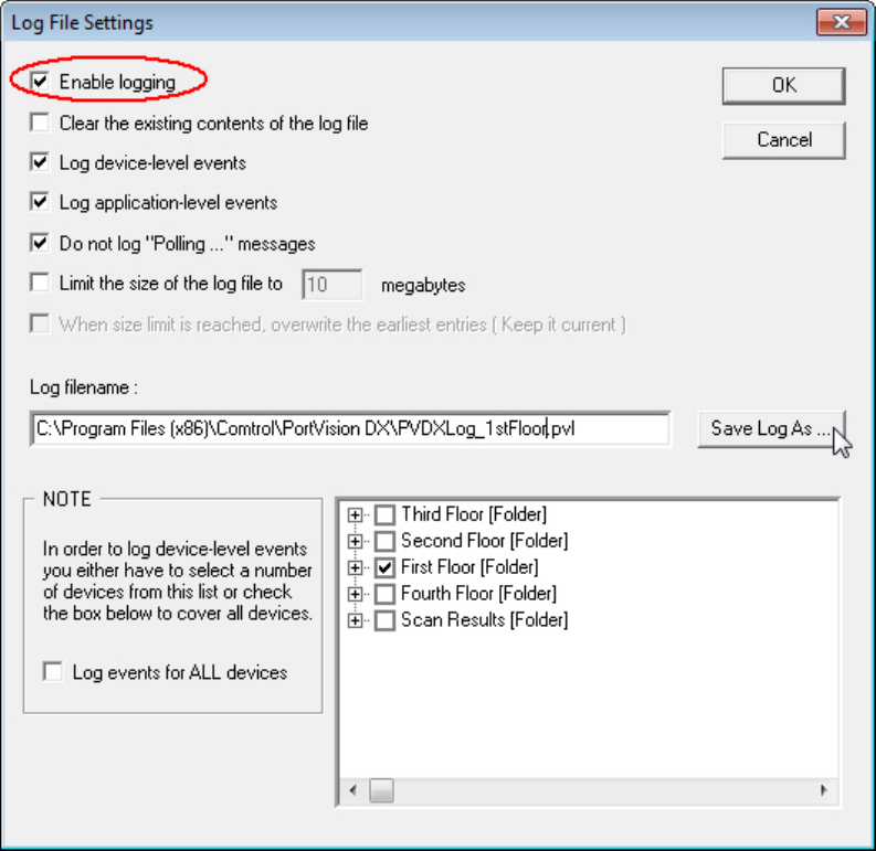For PortVision DX to create an event log, you must enable logging in the Log File Settings