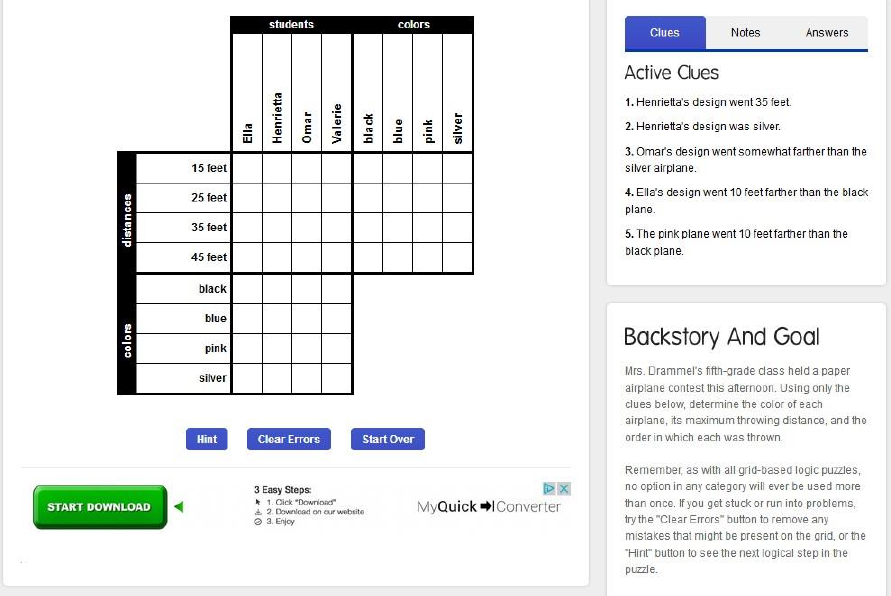 clues, and you must piece together deductions in order to ultimately assign a unique value for each category.