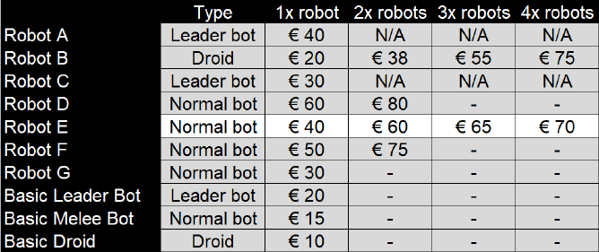 Robot Market prices The groups shall specify the price of their robot on Robot Market,