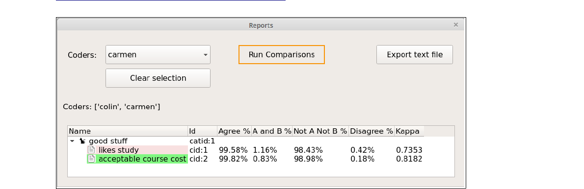 Reports can be generated for text coding and for coder comparison using the Cohen’s Kappa