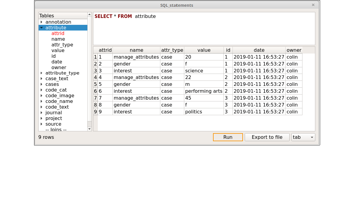 on a field name adds it to the SQL statement. Results can be exported to a text file. If you are not