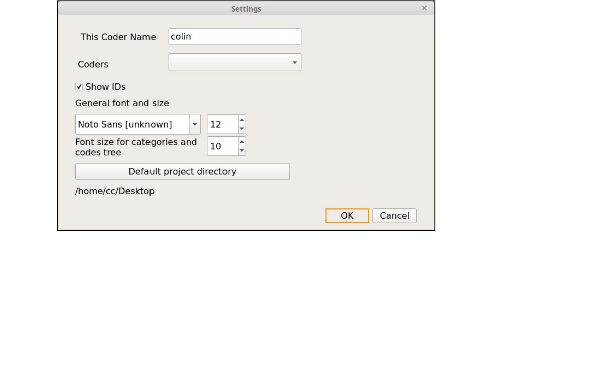 settings file contains the name of the current coder, a default working directory and choice of font.