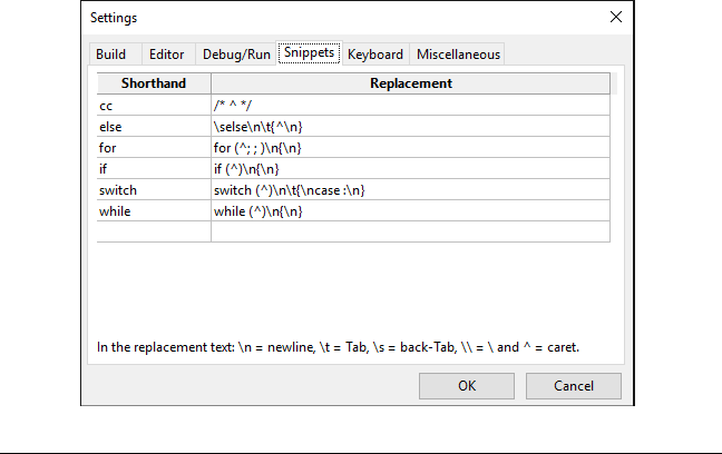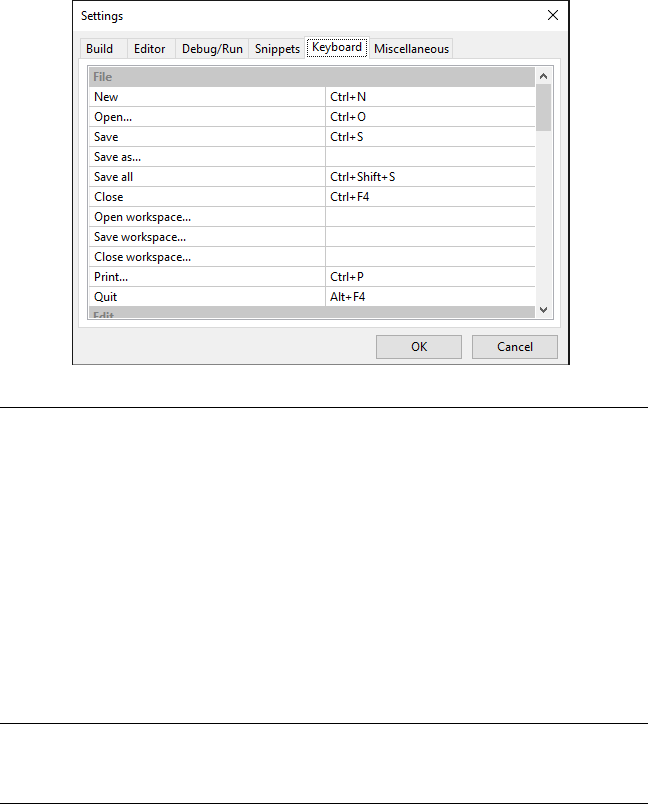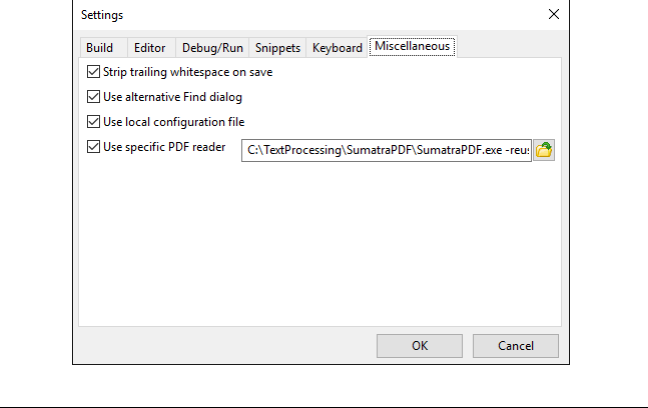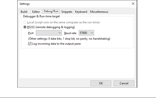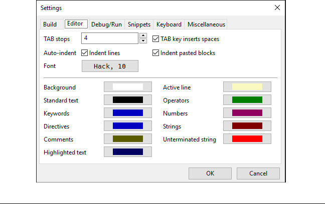 Editor settings, Debug/Run configuration, Snippets maintenance,