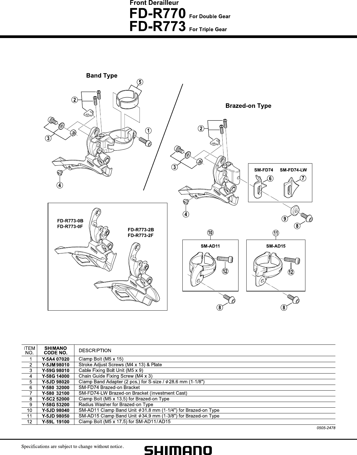Front derailleur installation band diameter S (28.6mm), M (31.8mm), L (34.9mm)