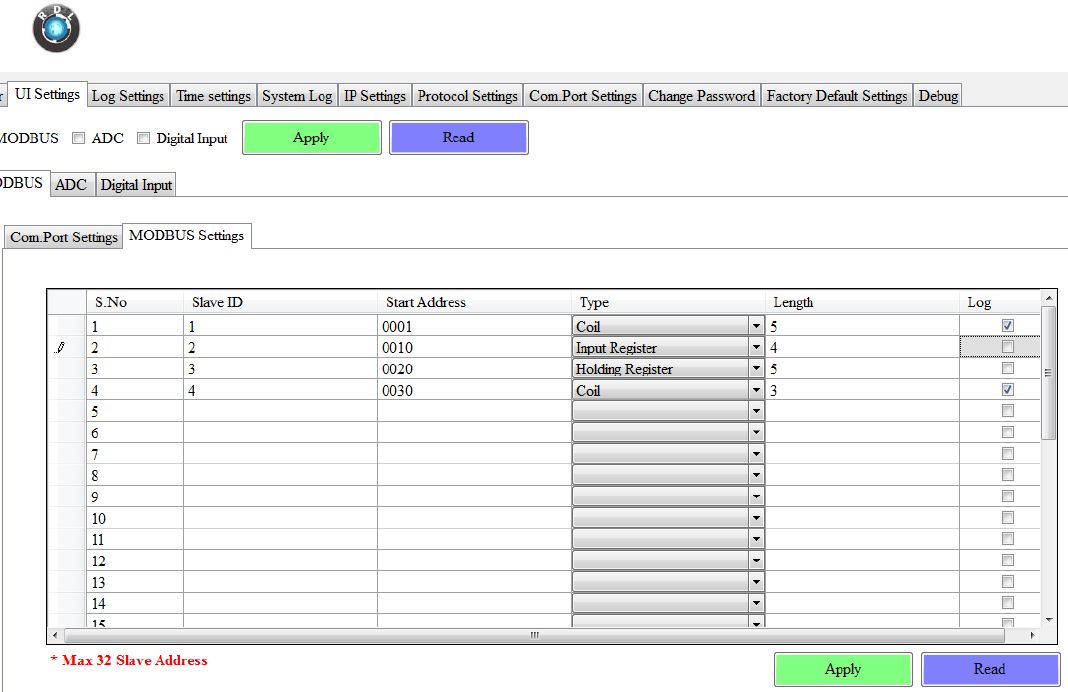 5. Log: If tick is enabled, the slave data pertaining to that slave id will be logger, if tick is
