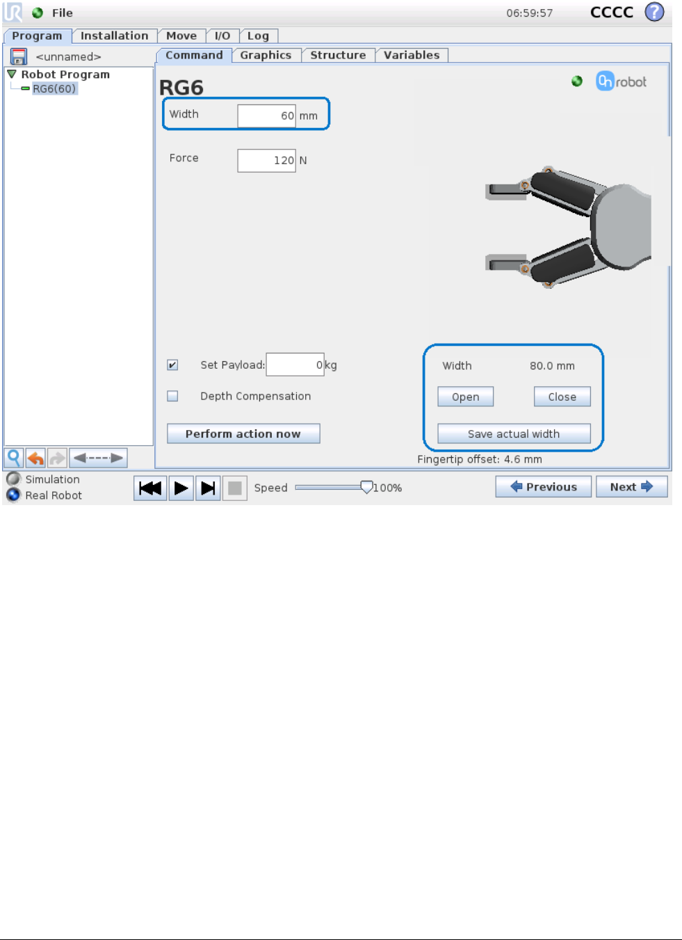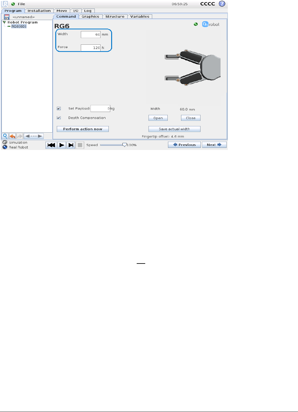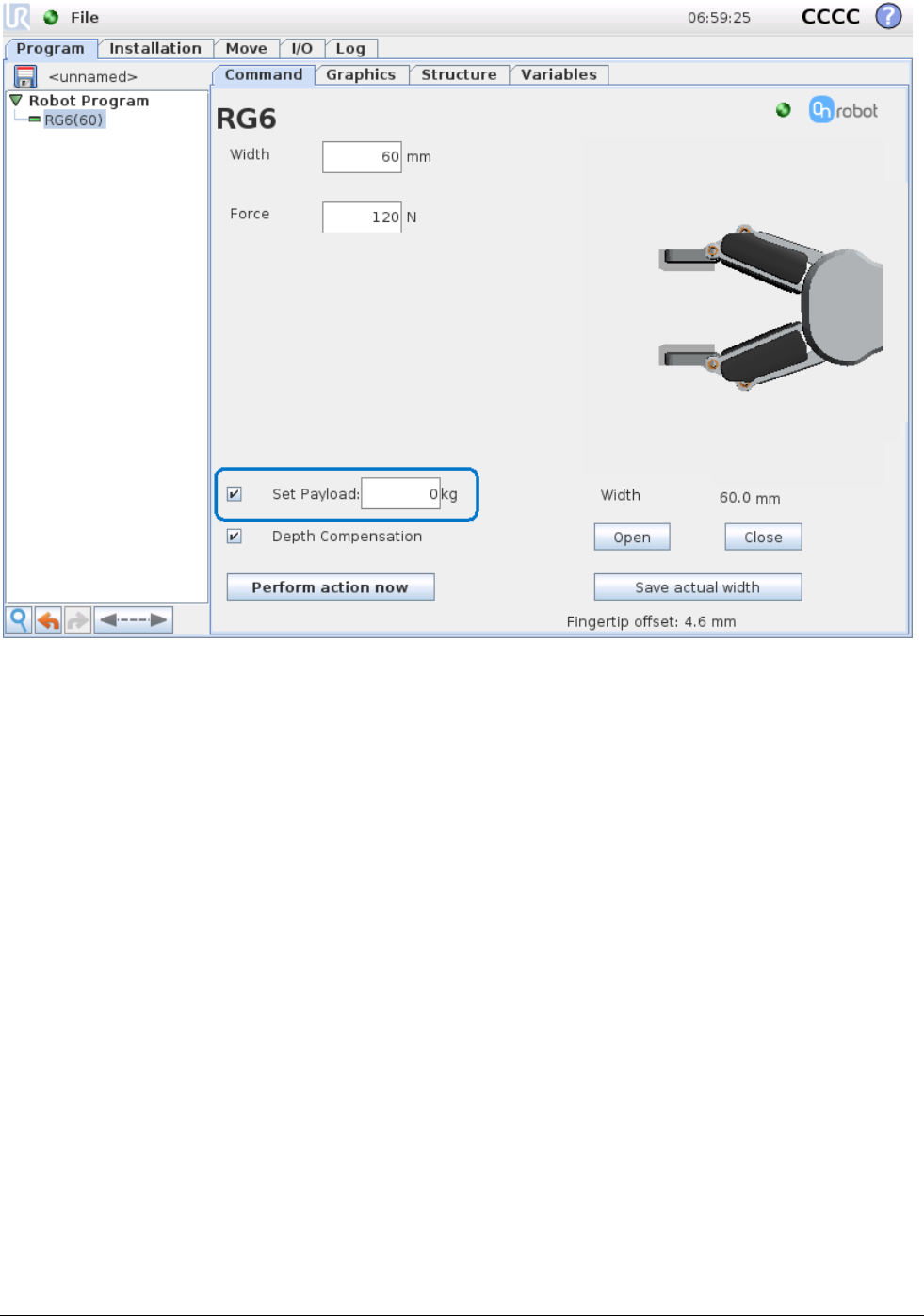 RG6(target_width=110, target_force=40, payload=0.0, set_payload=False, depth_compensation=False,
