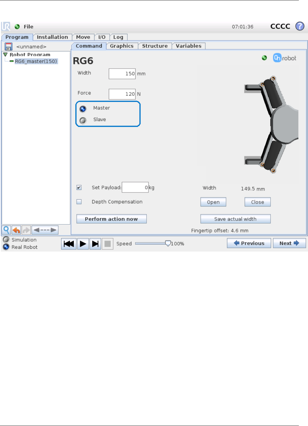 The Master/Slave buttons, selects if it is the master or slave Gripper, that should perform the action.