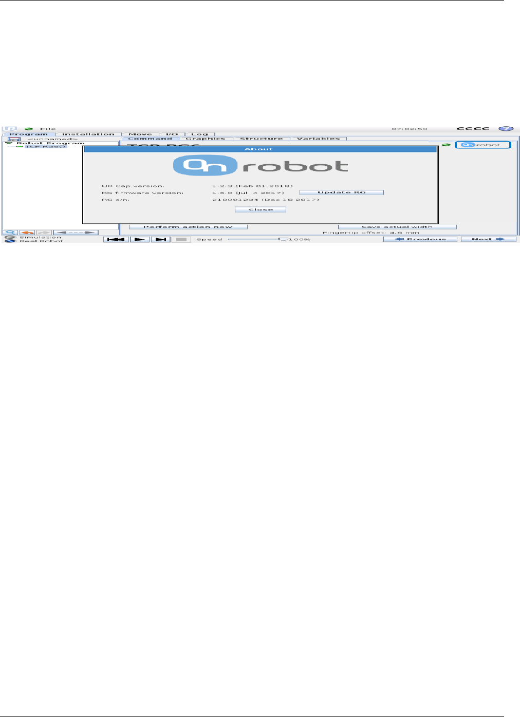 When pressing the Onrobot logo in the top right corner, the above box will appear. From this box, it is